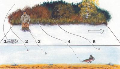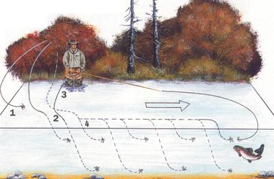 Шнур слегка выгибается дугой, и его вновь перекладывают вверх по течению, одновременно сдавая одну или две петли свободного шнура. Ход нимфы вследствие этого притормаживается, и она под действием силы, направленной вверх по течению, поднимается (4).