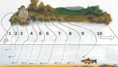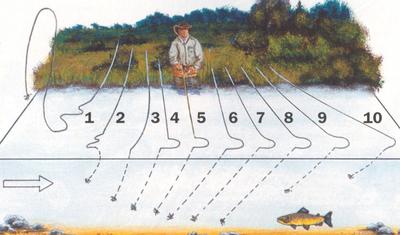 Одновременно происходит боковое смещение траектории дрейфа, которая находится ниже рыболова. Однако это не является недостатком, поскольку нимфа проходит сбоку от рыбы. Путем соответствующей проводки можно имитировать выползание на берег личинки веснянки. В заключительной фазе, которую определяет сам рыболов, прекратив сдавать шнур, нимфа по дуге поднимается наверх (10).