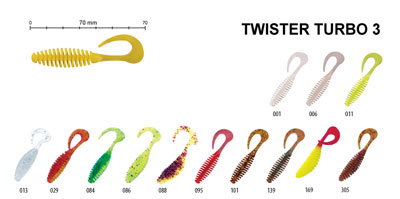 Характерной особенностью твистера является большой округлый хвост. В процессе проводки он создает колебательные движения, раздражающие воздействующие на рецепторы рыбы. Его круглое и гофрированное тело напоминает большого червяка. Проплывающую в толще воды приманку хищник не только видит, но и хорошо слышит.