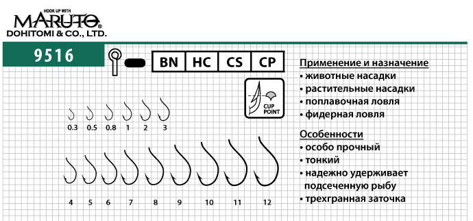 Но все-таки чемпионом по специализации в наших водах является карасево-карповый крючок. В силу специфики данной ловли к этим моделям предъявляются особые требования. Объект охоты - сильная и выносливая рыба, ведущая донный образ жизни, и зачастую – в достаточно «крепких» местах, поэтому главенствующим показателем качества будет повышенная прочность крючка. Однако и карп, и карась - одновременно и крайне осторожное существо – следовательно, высокой прочности желательно достигать не столько чрезмерным увеличением диаметра проволоки, сколько применением сталей с соответствующими характеристиками и, конечно, дополнительной проковкой моделей, особенно – в области поддева. Крючки новой серии 9516 – казалось бы, чистая классика, ну хотя бы внешне. Ловят на этот крючок и на традиционные насадки, и с помощью волосяной оснастки на бойлы. Но вот что касается жала, то, в отличие от классического крючка, здесь применена совершенно новая его форма, колюще-режущая. Название этой формы – Cup Point. Японские конструкторы снабдили острие тремя режущими боковыми кромками, сходящимися к вершине: они появились благодаря выборкам в коническом теле жала крючка: две кромки – по бокам и одна – на внутренней части. Это сделано для минимизации необходимого усилия подсечки: ведь ловля довольно нередко ведется на значительных расстояниях от самого рыболова, а, например, у карпа, как известно - прочные и мясистые губы, их нелегко пробить.