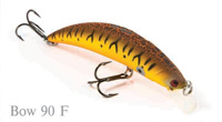 Плавающий акустический воблер Bow 90 F (90 мм, 10 г) по форме напоминает банан. За счет такой формы и вытянутой лопапасти с большим углом атаки обладает достаточно интенсивной собственной игрой – переваливается сбоку набок, практически не рыская из стороны в сторону. Поэтому при ловле взаброс (заглубление до 1 м) рекомендуемая проводка – Stop & Go, твичинг. Хорошо себя зарекомендовал при ловле на «дорожку» с большим отпуском (заглубление до 1,5 м). Приманка прекрасно ведет себя как на течении, так и в стоячей воде. Предназначена для ловли судака, щуки, а также крупного окуня.