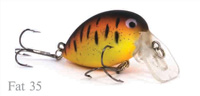 Плавающий Fat 35 (35 мм, 4,5 г) – типичный голавлевый воблер. Отличительной чертой этой акустической модели является прочная лопасть, расположенная практически под прямым углом к телу, за счет чего, во-первых, воблер получил активную рыскающую игру с частыми колебаниями, а во-вторых – прекрасно идет по мелководным речным перекатам (заглубление – до 0,4 м). Модель выпускается в двух размерах, есть еще вариант длиной 45 мм и массой 10 г.