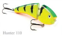 Тонущий двухсоставной деревянный джеркбейт Hunter 110 (110 мм, 32 г) – тоже ручного изготовления. Благодаря уплощенному с боков телу и рывковой проводке, рекомендуемой для приманок этого типа, получает игру, имитирующую поведение плотвы, подлещика, густеры – основной кормовой базы крупного хищника, особенно крупной щуки.