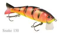 Деревянный воблер Snake 150 (150 мм, 40 г) – ручной работы. Особенность этого плавающего составника – в возможности регулировки угла наклона и формы алюминиевой лопасти. При более остром угле атаки игра воблера становится активнее, а заглубление увеличивается. Более тупой угол наклона лопасти делает проводку более развалистой (воблер активнее переваливается сбоку набок) и уменьшает глубину хода вплоть до движения у поверхности. Заглубление при ловле взаброс - до 0,5 м, при «дорожке» и троллинге – до 0,5-1,2 м (данные указаны для стандартного положения лопатки).