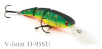 Глубинный трехсоставной воблер V-Joint D-95SU (95 мм, 22 г) с длинной широкой лопаткой благодаря шарнирным соединениям активно извивается в воде. Его резвая «игра» провоцирует на хватку даже малоактивного хищника. Имеет шумовую камеру в теле. Заглубление при ловле взаброс – до 3 м, при «дорожке» и троллинге – до 2,5-4,5 м.