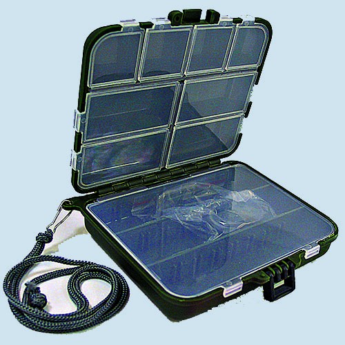 Двухстворчатая коробочка для крючков с отделениями в каждой ее части. Каждое отделение створки имеет защитную прозрачную крышку. Коробочка имеет ремешок для переноски. Размер:125х105х35(мм).
