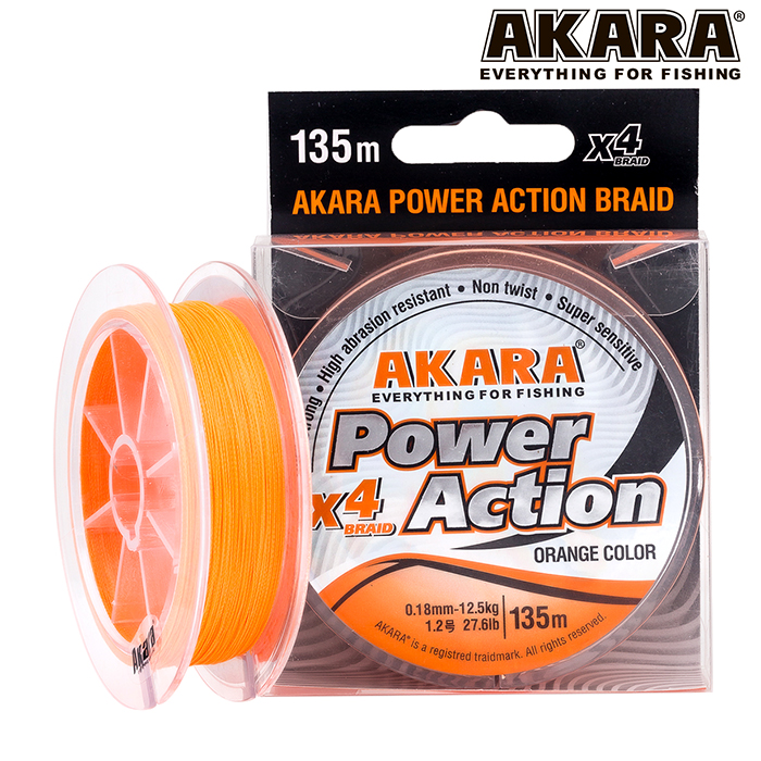 Power Action X-4 Orange 135 - универсальный плетёный четырехжильный рыболовный шнур, выпускаемый под торговой маркой Akara. Шнур создан для того, чтобы удовлетворить потребности рыболовов в качественном, надежном, прочном и недорогом шнуре. Шнур оранжевого цвета. Изготовлен из плотного волокна японского производства. Шнур отличается высокой прочностью и надежностью, имеет круглую форму, абразивоустойчив и подойдет практически для любых условий лова, в том числе для ловли в местах, где высока вероятность зацепов. Поставляется в намотках 135 метров. Диапазон диаметров от 0,06 до 0,2 мм при тесте от 4,3 до 15,1 кг. Шнур отличается высокой прочностью и надежностью, имеет круглую форму, абразивоустойчив и подойдет практически для любых условий лова, в что числе для ловли в местах, где высока вероятность зацепов. Поставляется в намотках 135 метров.