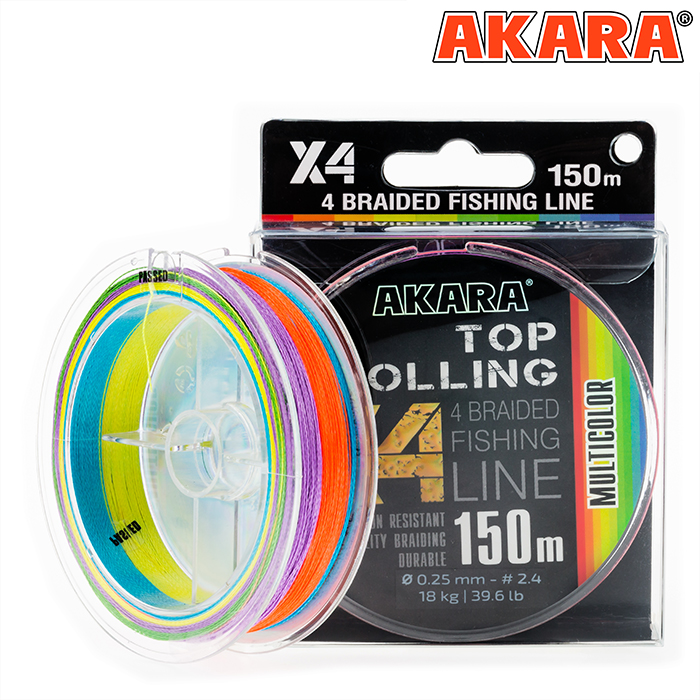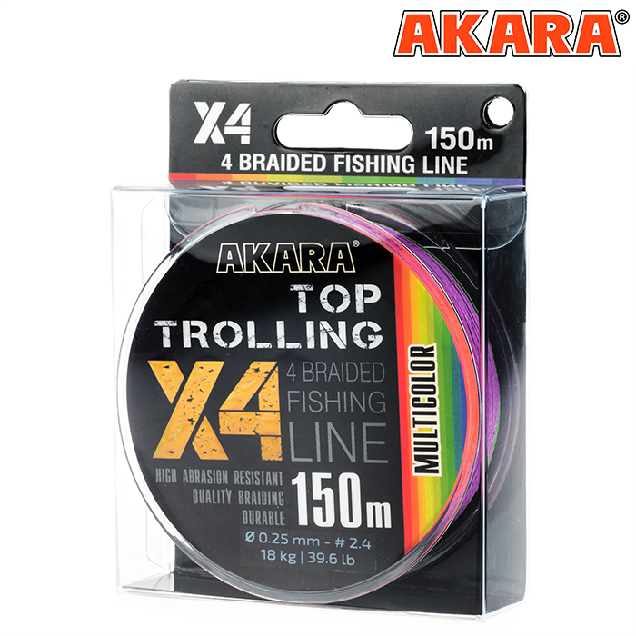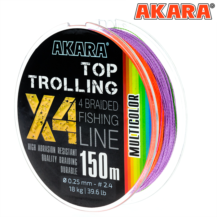 Akara Top Trolling X-4 150м - полиэтиленовый шнур круглого сечения. Цвет меняется через каждые 10/25 метров, что позволяет контролировать дальность заброса или отпуска приманки. Материал, из которого выполнен шнур, высокотехнологичный японский Super PE, отличается повышенными разрывными нагрузками и обладает свойствами самополировки. Другими важными особенностями данного шнура является его высокая гладкость и малошумность, что позволяет делать эффективные дальние забросы и легко вываживать рыбу. Хорошо подходит для ловли в заброс, троллинга и ловли в отвес. Удобная размотка по 150 метров позволяет реже выбрасывать короткие оставшиеся куски, и одной шпули хватит не на один сезон.