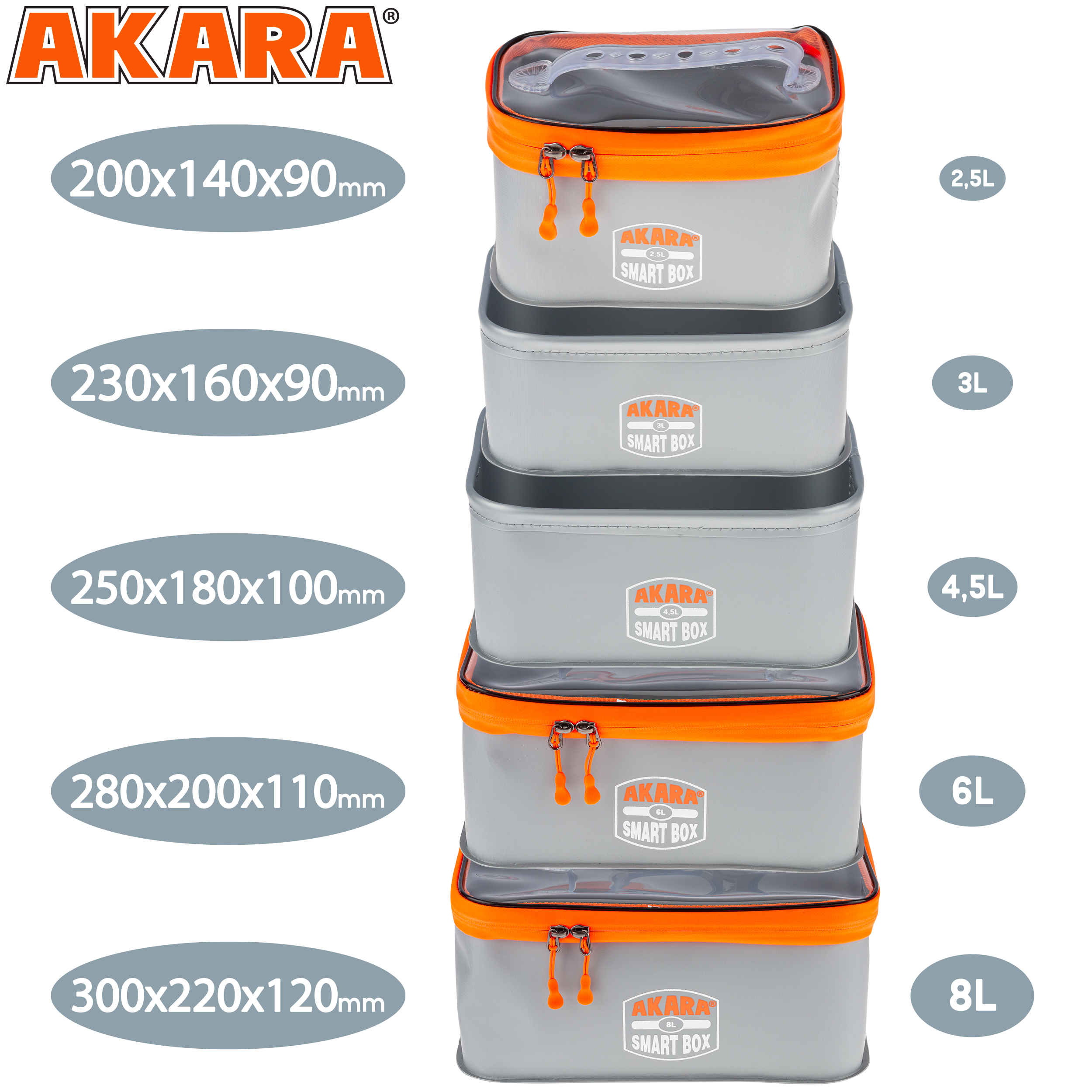 Набор из пяти сумок Akara Smart Box 5 в 1 — это отличное решение для рыбаков и туристов. Три сумки с прозрачными крышками и прочной молнией обеспечивают полную герметичность, а две ёмкости без крышки подходят для замешивания прикормки или быстрого доступа к снаряжению. Сумка-кан Akara Smart Box — это незаменимый аксессуар для рыбаков и туристов. Она изготовлена из прочного ПВХ, поэтому прослужит вам долгое время. Благодаря надёжной и плотной молнии у трех моделей в наборе, сумка максимально герметична, что позволяет сохранить ваши вещи сухими. Эта сумка многофункциональна: её можно использовать для хранения и транспортировки рыбы, замешивания прикормки, переноса воды и хранения рыболовных снастей и принадлежностей. Сумка оснащена двумя прочными ручками для переноски и лямкой для ношения на плече, что обеспечивает удобство использования. Отлично подойдёт для организации хранения в лодке, катере или на яхте. Прозрачная верхняя крышка позволяет легко увидеть содержимое сумки, не открывая её.
