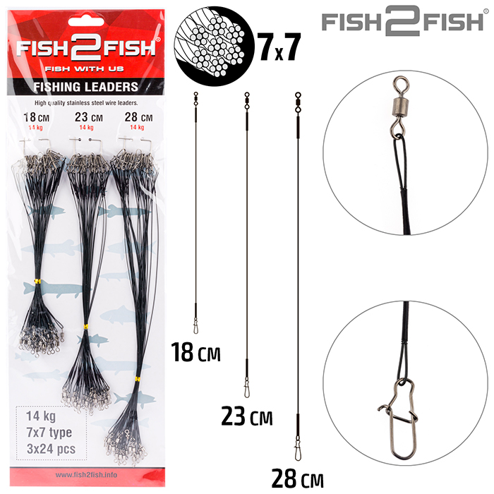 Материал для поводков Fish2Fish свит из тончайшей проволоки, выполненной из нержавеющей стали. Поводок оснащен застежкой и качественным вертлюжком. Поводок выпускается в нескольких сериях: 1x7 - (7 сплетенных нитей) – серия отличается наибольшей жесткостью, что позволяет лучше чувствовать приманку на дальних дистанциях заброса. 7x7 - (49 сплетенных нитей) – серия имеет повышенную эластичность за счет уменьшения поперечного сечения используемой нити, что позволяет приманке совершать более естественные движения в воде.