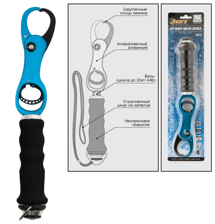 Захват для рыбы с весами - инструмент для захвата и удержания рыбы во время извлечения приманки или взвешивания. Алюминиевый зажим со скругленными концами снижает вес изделия и не травмирует рыбу. Неопреновая нескользящая рукоять и страховочный шнур обеспечивают комфортную и безопасную эксплуатацию.