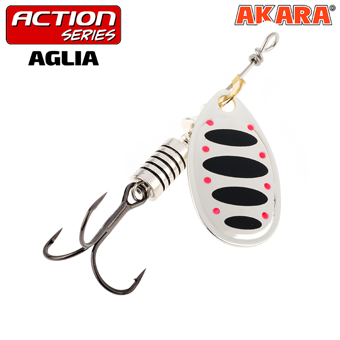 Aglia - классическая блесна от Akara. Универсальная вертушка для ловли на любом типе водоемов. Благодаря большому углу атаки лепестка есть возможность проводки на минимальных скоростях, а при ловли на струе держать блесну без подмотки, давая ей плавно съезжать перпендикулярно течению.