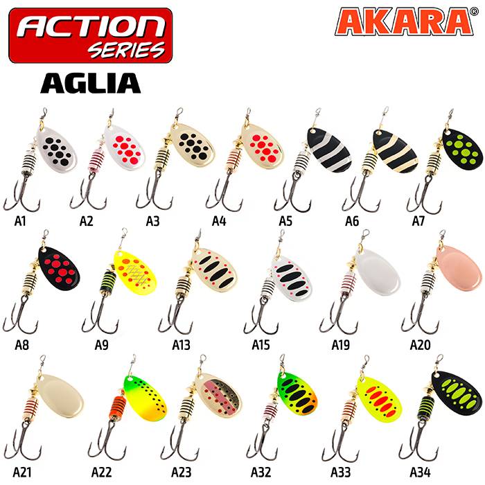 Aglia - классическая блесна от Akara. Универсальная вертушка для ловли на любом типе водоемов. Благодаря большому углу атаки лепестка есть возможность проводки на минимальных скоростях, а при ловли на струе держать блесну без подмотки, давая ей плавно съезжать перпендикулярно течению.