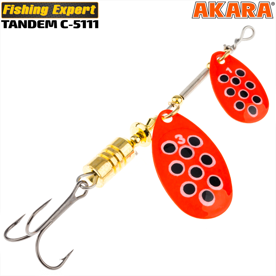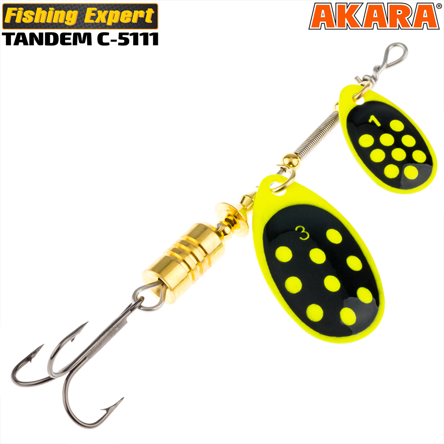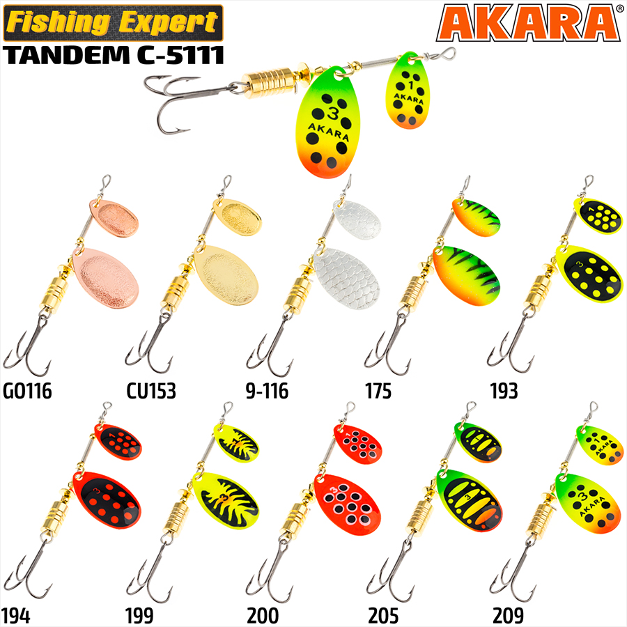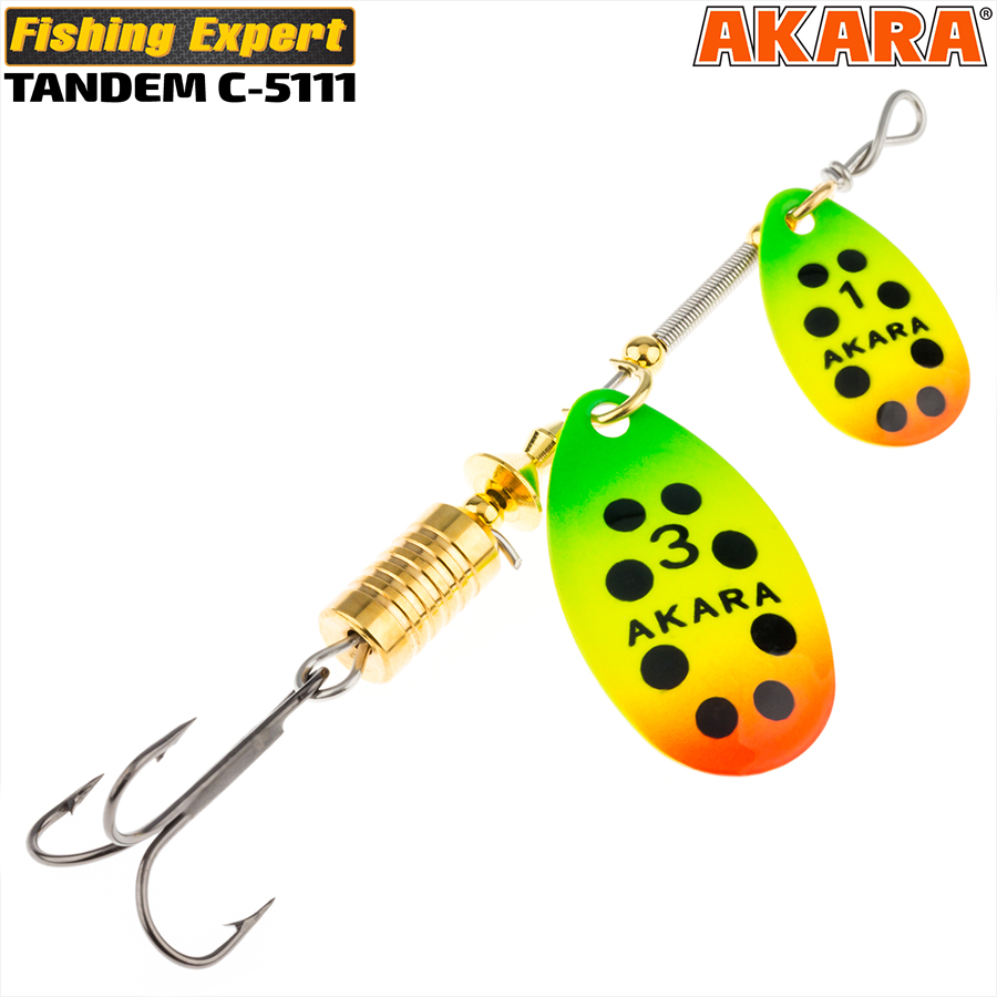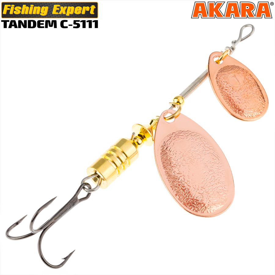 Tandem - классическая вертушка с двумя лепестками формы Aglia. Характеризуется увеличенным шумовым и зрительным эффектом. Часто используется при ловле в траве и коряжнике, за счет того, что тандем из двух лепестков припятствует зацепу. Рекомендована для ловли на слабом течении и в стоячей воде.