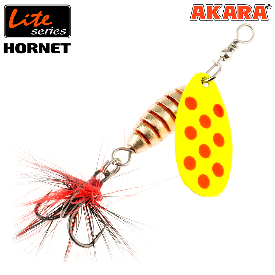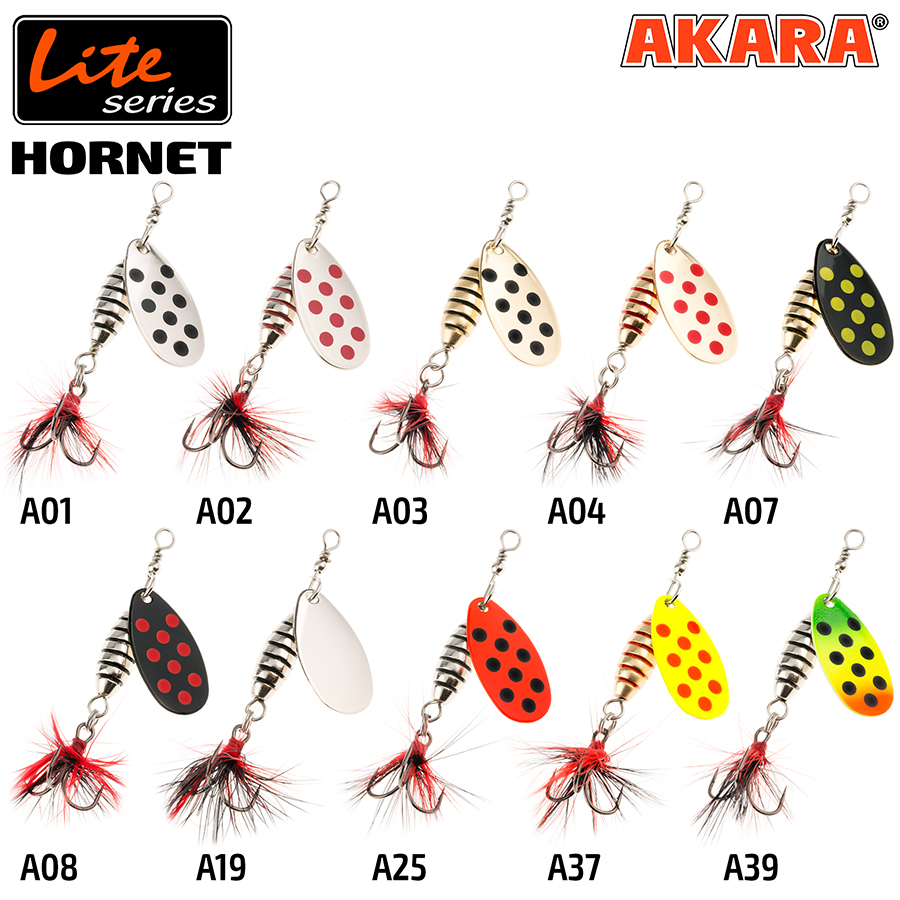 Блесна Akara Lite Series Hornet - хорошо зарекомендовавшая себя и проверенная временем модель вертушки. Лепесток яйцеобразной формы имеет широкий угол раскрытия. Во-первых, это обеспечивает упористую игру и отличную чувствительность при проводке любым спиннингом. Вы в любой момент проводки будете прекрасно понимать работает вертушка или уже насобирала травы и не крутится. Во-вторых, это приводит к максимальным возмущениям воды, что делает приманку более заметной для рыбы. Компактный и тяжелый сердечник позволяет делать дальние забросы. От предыдущей версии эту блесну отличает появившийся тройник с опушкой. Благодаря увеличенной парусности тройника положение вертушки при проводке получается более стабильным. Поэтому ей можно работать на очень медленных скоростях проводки, и ловить самого капризного и несговорчивого хищника.
