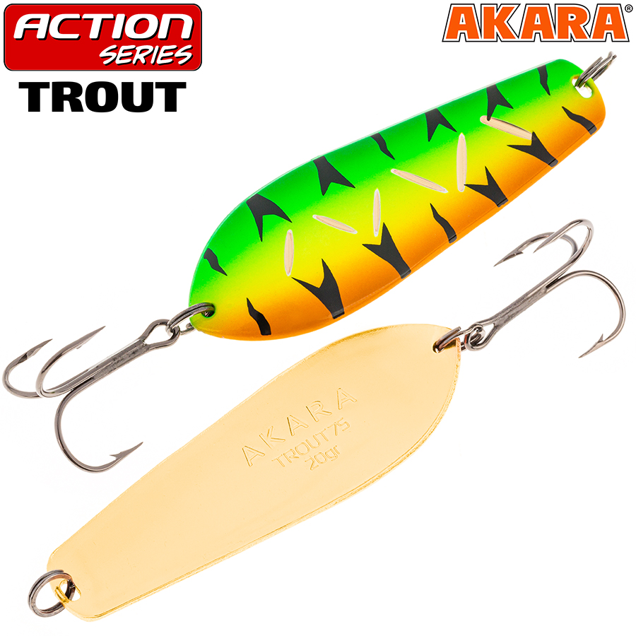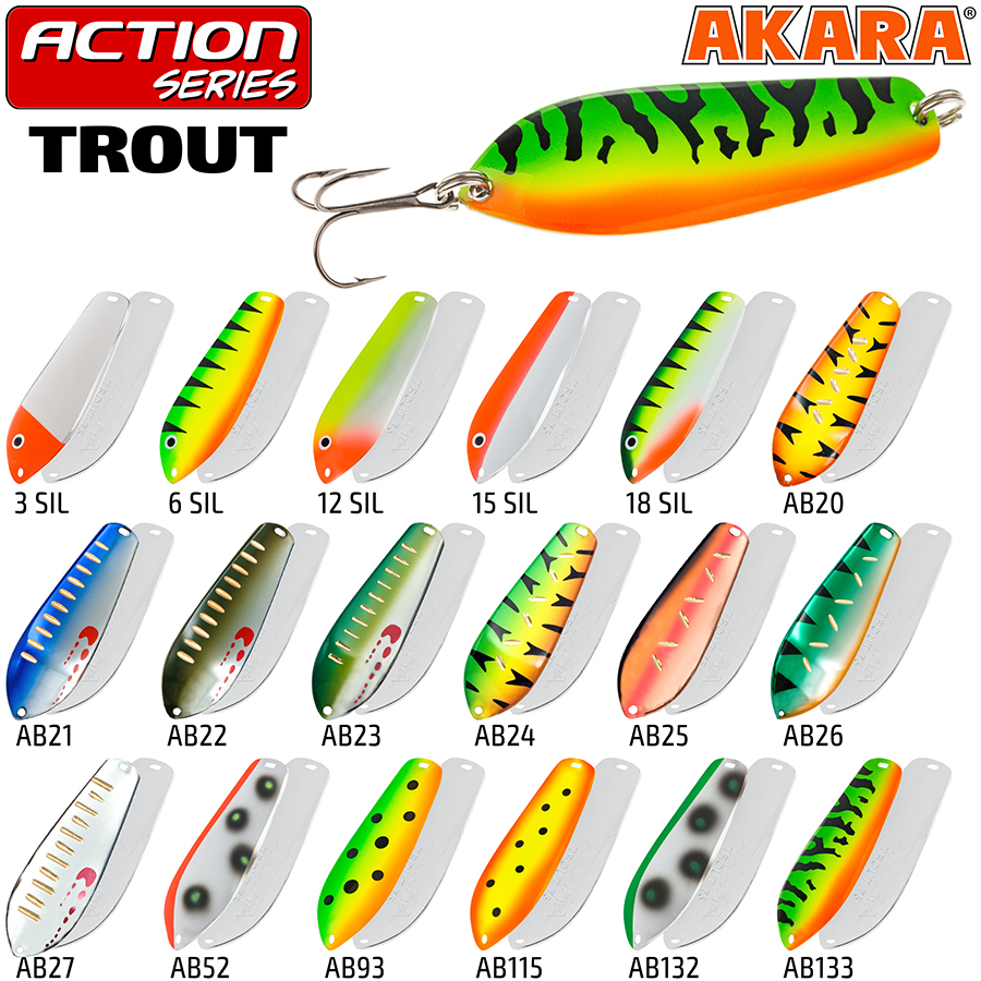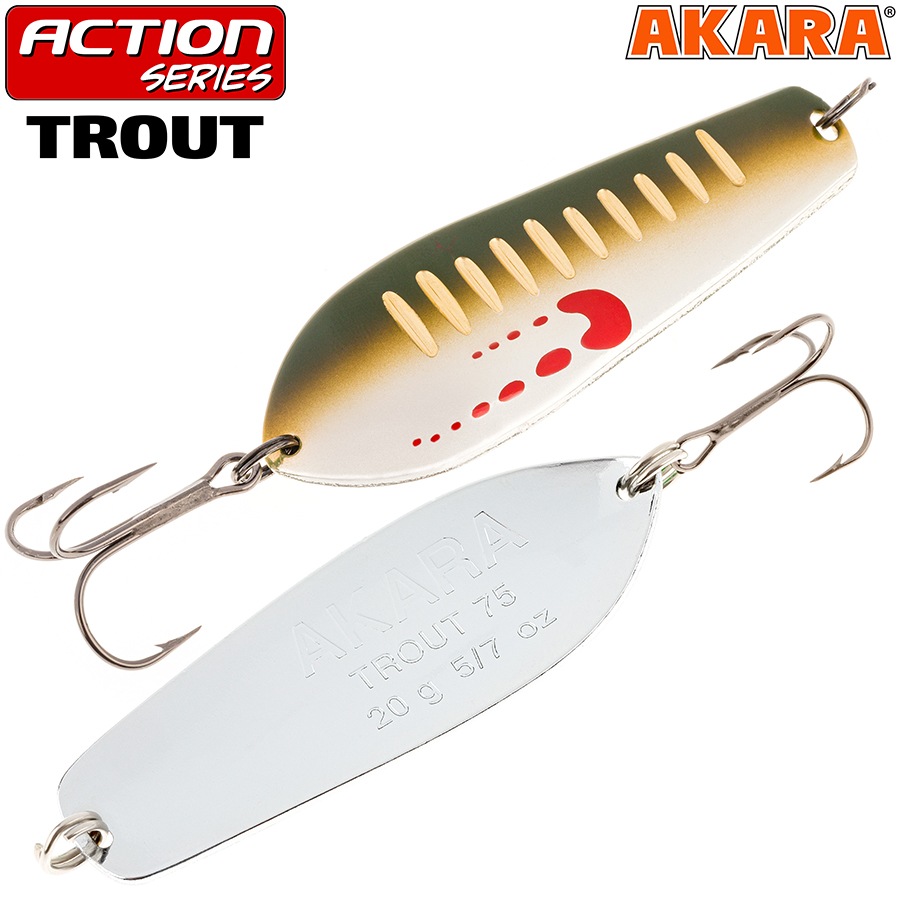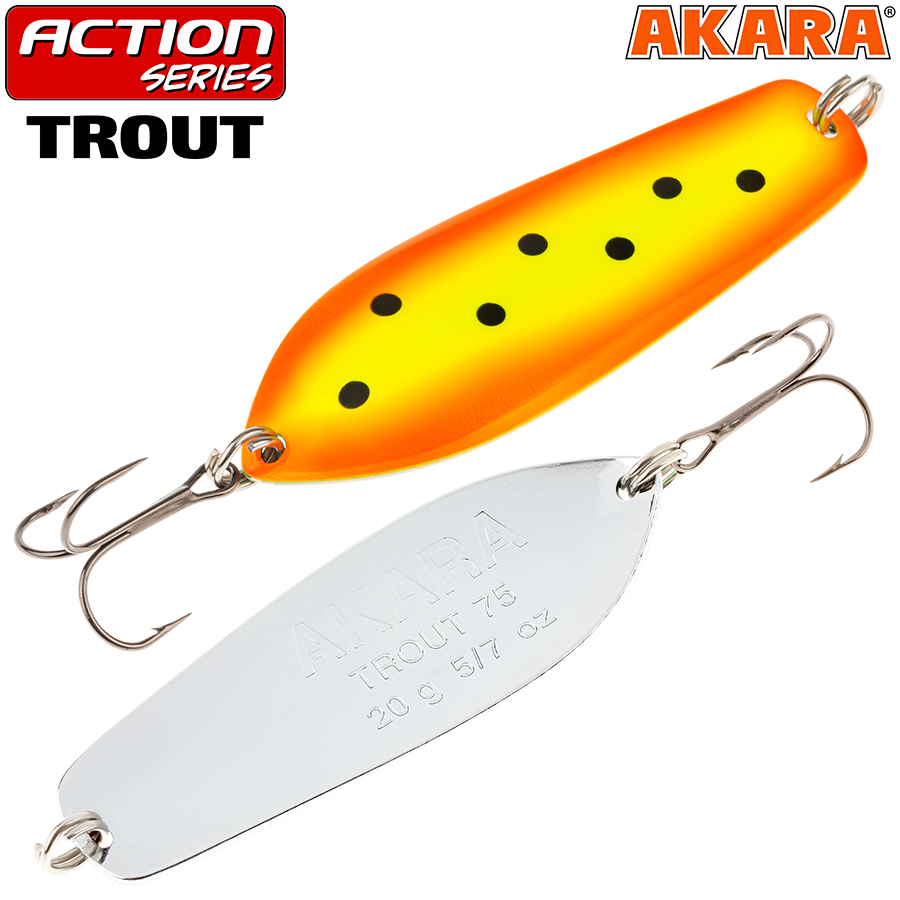 Блесна колебалка Akara Action Series Trout - классическая блесна для ловли лососевых, судака, щуки. Проверенная временем форма не стабильная размашистая игра неизменно провоцируют хищника на хватку. Широкая цветовая гамма позволяет легко подобрать нужный цвет в зависимости от степени освещенности воды. С успехом используется для ловли в заброс и троллингом.