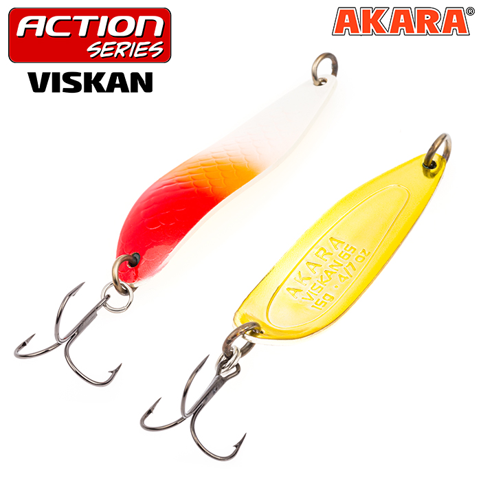 Akara Action Series Viskan – блесна разработана, прежде всего для ловли лососевых. Узкое тяжелое тело обеспечивает отличные полетные характеристики для точного и дальнего заброса, а характерный загиб гарантирует стабильную игру в струе. Приманка отличается резкой, агрессивной игрой, заводится с первых сантиметров проводки. Трофеями Viskan являются: семга, кумжа, чавыча, сима и таймень. В центральной России к ней не останутся равнодушными жерех, щука и судак.