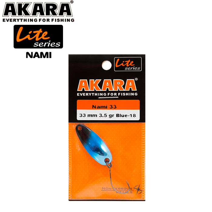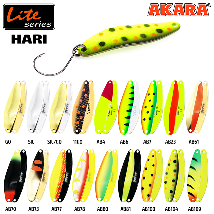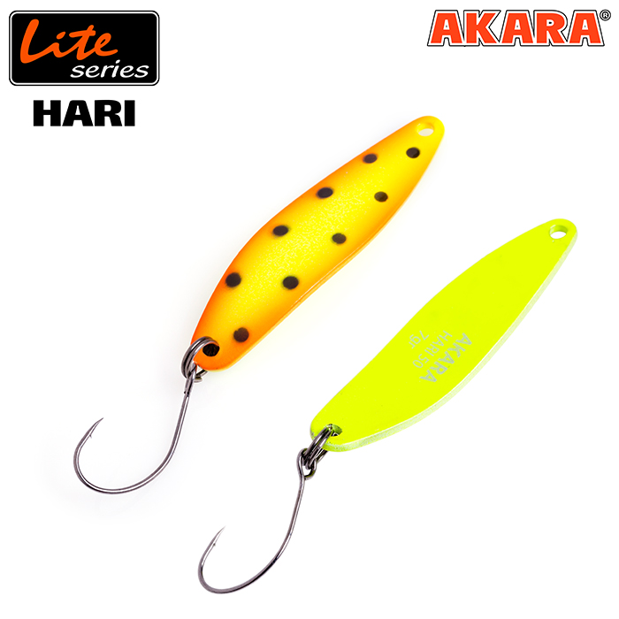 Akara Lite Series Hari 50. Блесна имеет превосходные полетные данные, позволяющие использовать ее на длинных дистанциях, что очень важно при ловле осторожной рыбы, прежде всего жереха и форели. Узкая, имитирующая малька форма блесны демонстрирует активную и устойчивую игру средней частоты. Так же, прогонистое тело приманки обеспечивает успешное применение ее на течении: при проводке на снос или против струи.