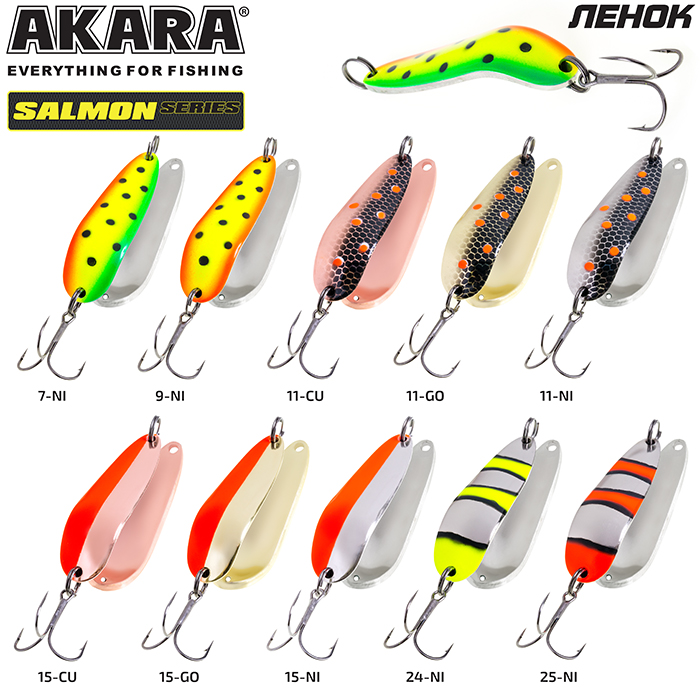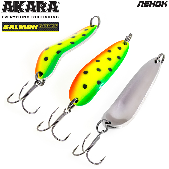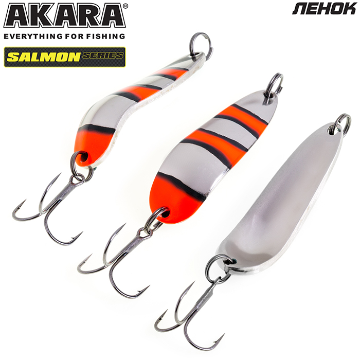 Колеблющаяся блесна Akara серии Salmon. Пожалуй, одна из лучших колебалок для ловли лососёвых пород рыб. Благодаря специально разработанной и многократно испытанной форме, великолепно провоцирует хищника на атаку. Варианты различных весов и размеров, позволяют ловить ею как на сносе течением при боковых забросах, так и в ямах, но не с сильным течением. Благодаря своей форме, блесна обладает, мелкой высокочастотной игрой, меняющейся по амплитуде, в зависимости от размера и веса, что как раз так нравится лососёвым. Щука, окунь, судак и пассивный жерех, тоже не оставят данную приманку без внимания. Из-за особенностей прямой проводки, на лёгкие веса Akara Salmon, можно успешно ловить по мелководным перекатистым речкам и травянистым озёрам.