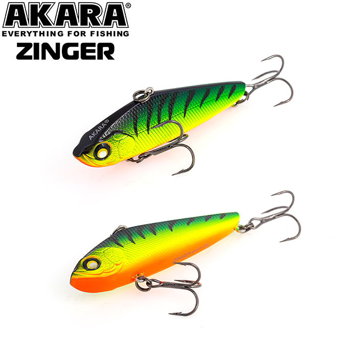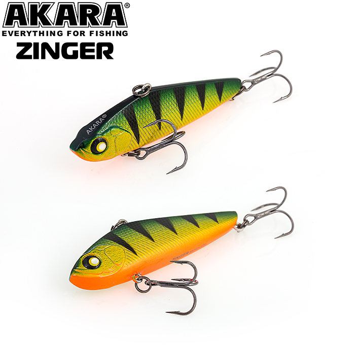 Отличие зимнего воблера от воблеров применяемых для летнего лова хищных рыб заключается в том, что крепление лески, шнура или поводка осуществляется не к голове приманки, а спине, благодаря чему при горизонтальной проводке и вертикальных подбросках воблер демонстрирует высокочастотную мелкоамплитудную игру. На такую игру, напоминающую тряску, очень хорошо реагирует судак, который и является основной добычей этого воблера. Зимний воблер (другие названия раттлин или виб) Akara ZINGER, имеет классическую форму и превосходную игру, он хорош тем, что практически моментально заводится и не требует специальных навыков при проводке. Воблер универсальный и одинаково успешно работает в любой сезон, на различных глубинах, на вертикальных подбросках и при горизонтальной проводке. Akara Zinger выпускается в двух размерах 60 и 65 мм, весом 9 и 12 грамм. Тонущий. Акустический.