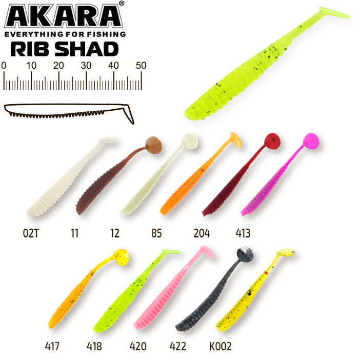 Akara Rib Shad - виброхвост очень маленького размера с довольно крупной пяткой, за счет чего приманка обладает активной собственной игрой. Ребра на теле приманки создают дополнительные колебания во время проводки. Используется для ловли на микроджиг или на небольшие чебурашки с одинарным крючком. Размер приманки 45 мм.