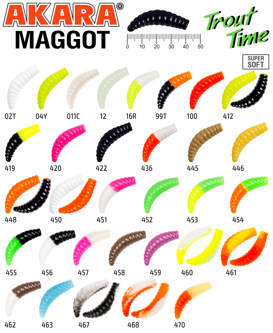 Силиконовая приманка Akara Trout Time MAGGOT - благодаря сверхсильному аттрактанту, способна привлечь даже неактивную форель. Аттрактант незаменим при ловле пассивной форели, а также в условиях холодной и мутной воды. Рекомендуется использовать с джиг-головками или одинарными крючками. Высокое качество материалов и грамотно подобранные ароматы позволяют этой приманке оставаться уловистой даже тогда, когда другие перестают работать. Широкая цветовая гамма позволит подобрать оптимальную приманку под любые условия ловли.