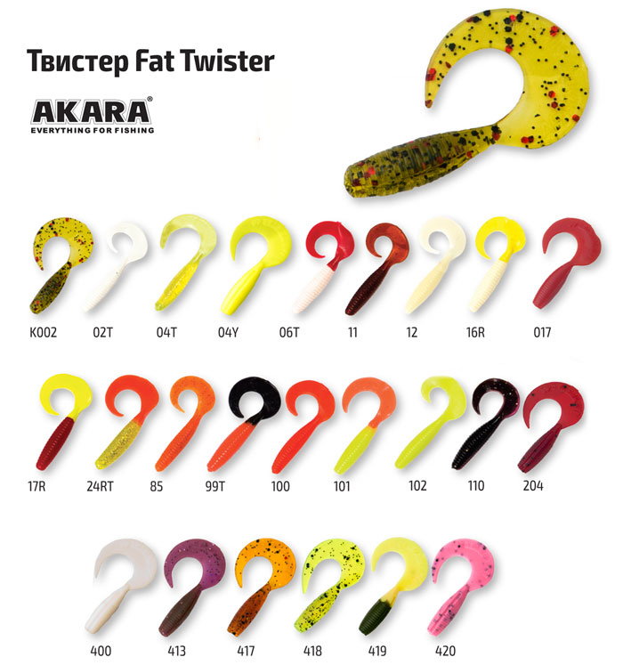 Akara Fat Twister твистер с коротким телом и тонким серпообразным хвостом. Обладает живой, натуральной игрой. Размер 25 мм с успехом используется для ловли на микроджиг. Более крупные твистера можно оснащать офсетным крючком и двойником с чебурашкой. Выпускается в размерах 25, 35, 40 и 45 мм.