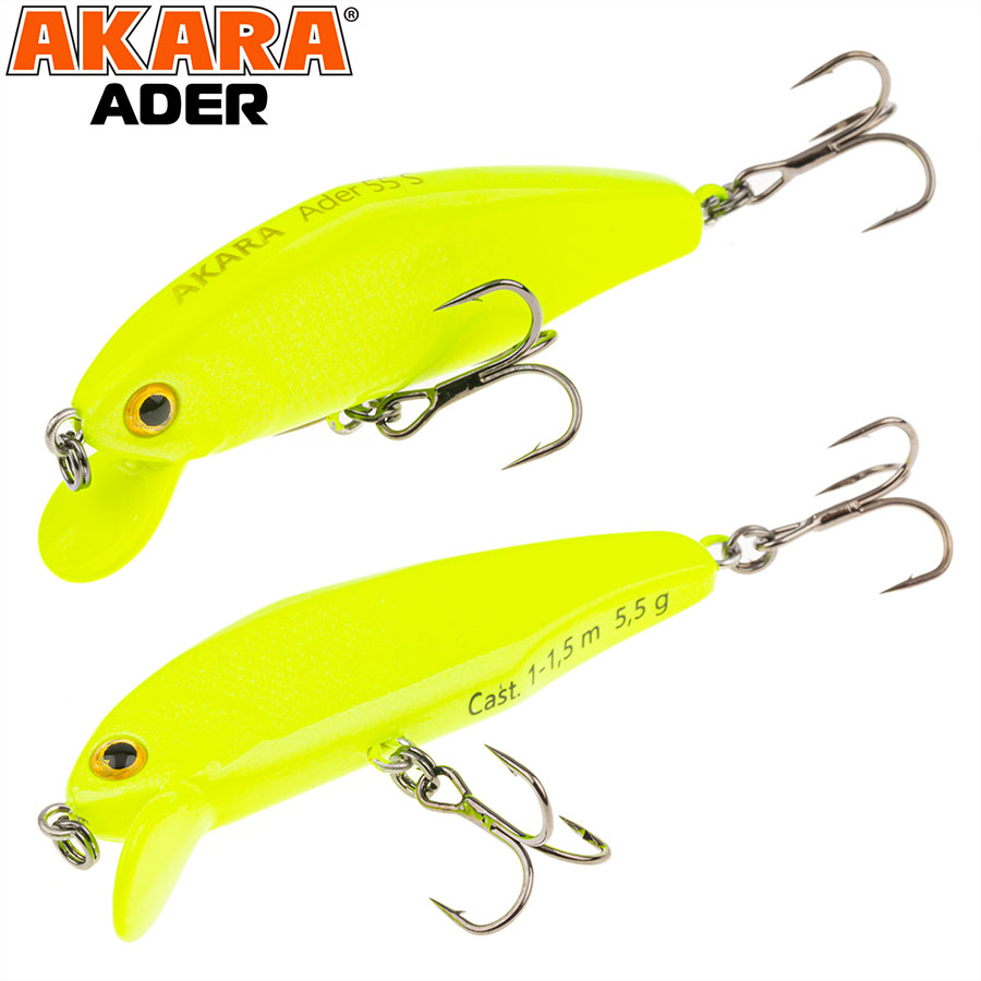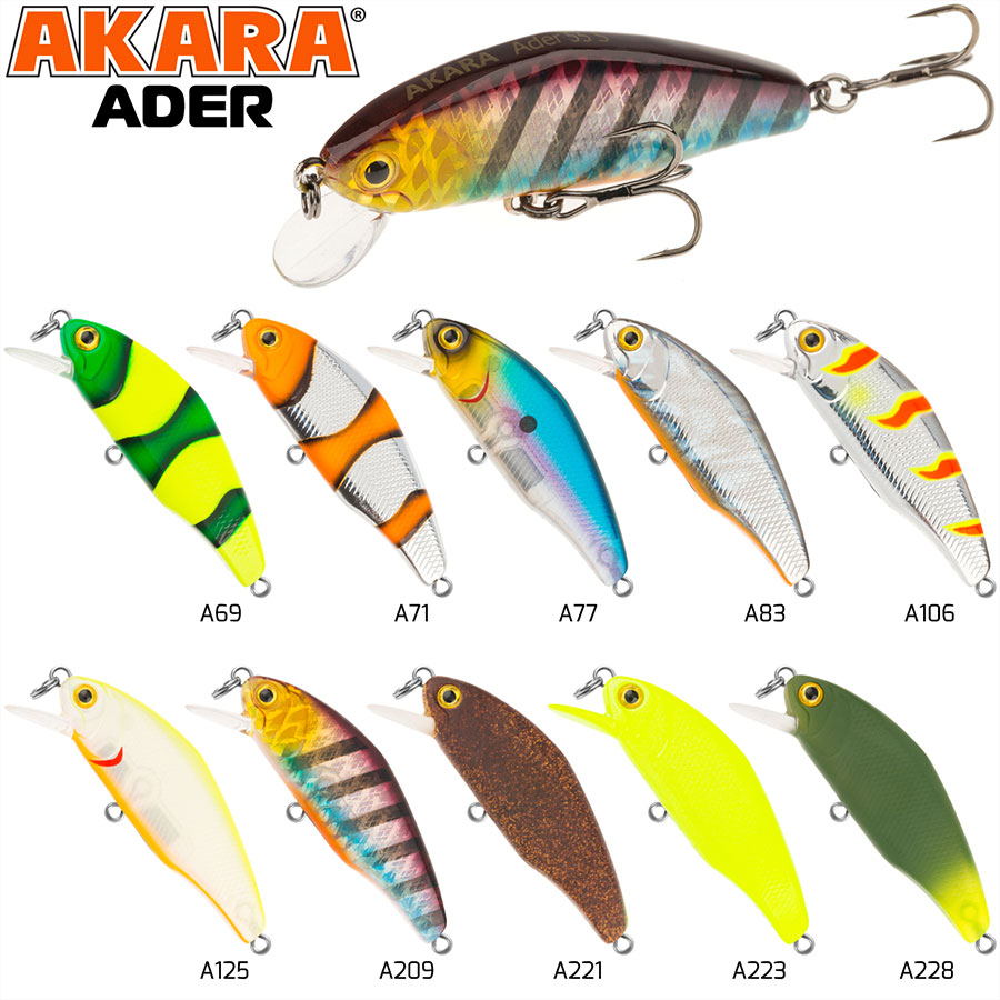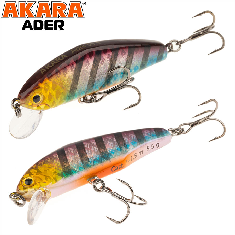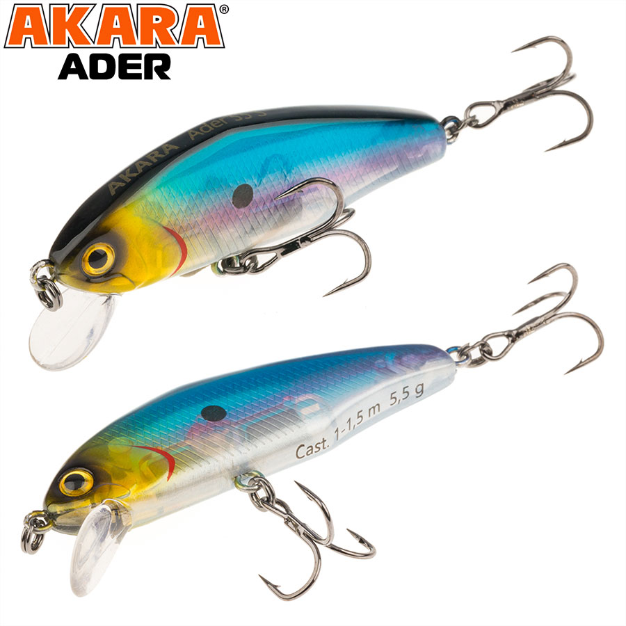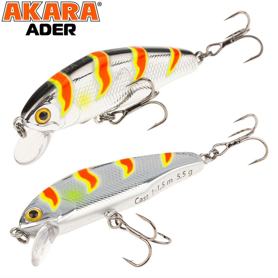 Воблер Akara Ader - небольшая тонущая миношка предназначена главным образом для твичинга. Игра приманки замечательно раскрывается на резких и коротких рывках. Воблер хаотично бросается из стороны в сторону изображая запаниковавшено малька. Несмотря на то, что данная приманка больше предназначена для ловли на течении, одной из ее фишек является поведение на паузе на спокойной воде. В таких условиях воблер тонет в горизонтальном положении красиво покачивая боками. При ловле на реках этот воблер больше подойдёт для ловли форели и голавля. А при ловле на озёрах его основной добычей будут окуни. Тонущий. Акустический. Заглубление при кастинге 1 до 1,5 м