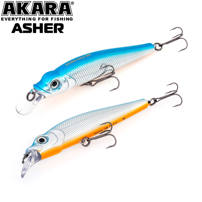 Akara Asher 80F – плавающий воблер класс минноу длиной 80 мм. Благодаря лопасти оригинальной формы стабильно работает как на рывковой проводке, так и на равномерной. Отлично держит сильное течение, не сбиваясь с игры. Подходит для ловли многих видов рыб, как хищных, так и мирных. Заглубление при ловле в заброс до 1,0 м. Допускается применение данной модели воблера для ловли троллингом. Оснащен крючками из высокоуглеродистой стали. Новинка 2019 года.