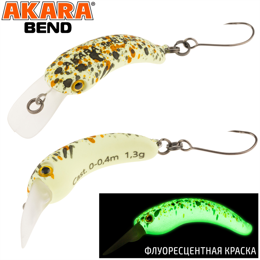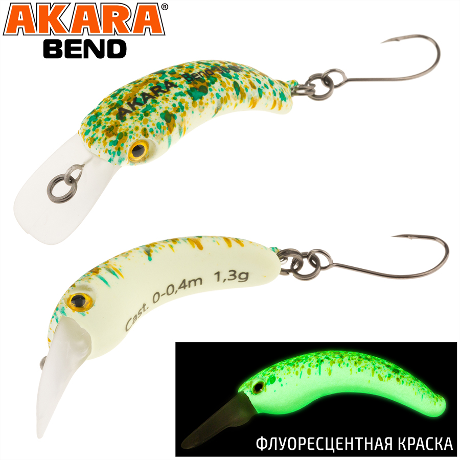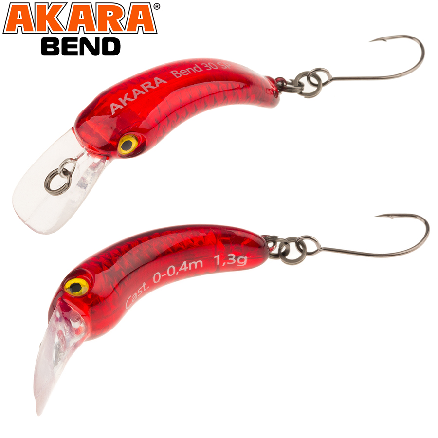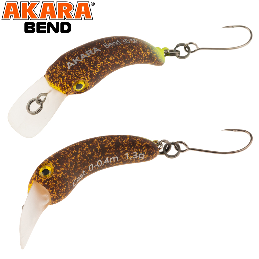 Воблер Akara Bend - включает в себя две модели отличающиеся по размеру 30 и 40 мм. Воблеры предназначены для ловли прудовой форели на медленной и очень медленной проводке. Проводить примаку надо с минимальной скоростью при которой она начинает играть. Работает как равномерная проводка, так и проводка с паузами. На паузе приманка медленно тонет или замирает на месте. В зависимости от веса крючка воблер может быть как суспендером, так и слаботонущим. Модель размером 40 мм при проводке имеет шумовой эффект. Суспендер. Заглубление при кастинге 30 мм - 0 до 0,4 м, 40 мм - 0 до 1,0 м.