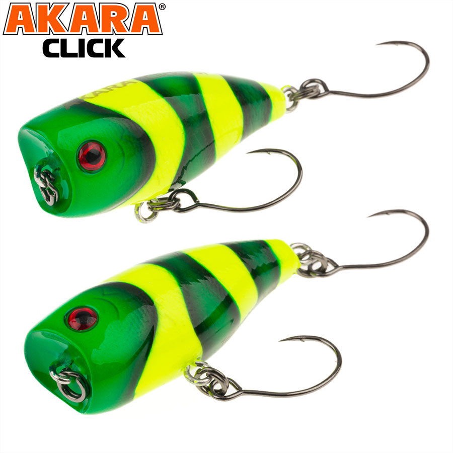 Воблер Akara Click - небольшой поппер завоевал большую популярность при ловле прудовой форели. Небольшой и компактный размер позволяет далеко забросить приманку на тонком шнуре. Игра может быть очень разнообразная. От обычных стандартных бульков с паузами, до еле заметных коротких потяжек, от которых поппер едва шевельнется и пустит небольшую волну по поверхности воды. Естественно, что кроме форели приманка отлично подойдёт и для ловли окуня. В этом случае лучше подойдёт более агрессивная проводка. Акустический. Плавающий. Поверхностный.