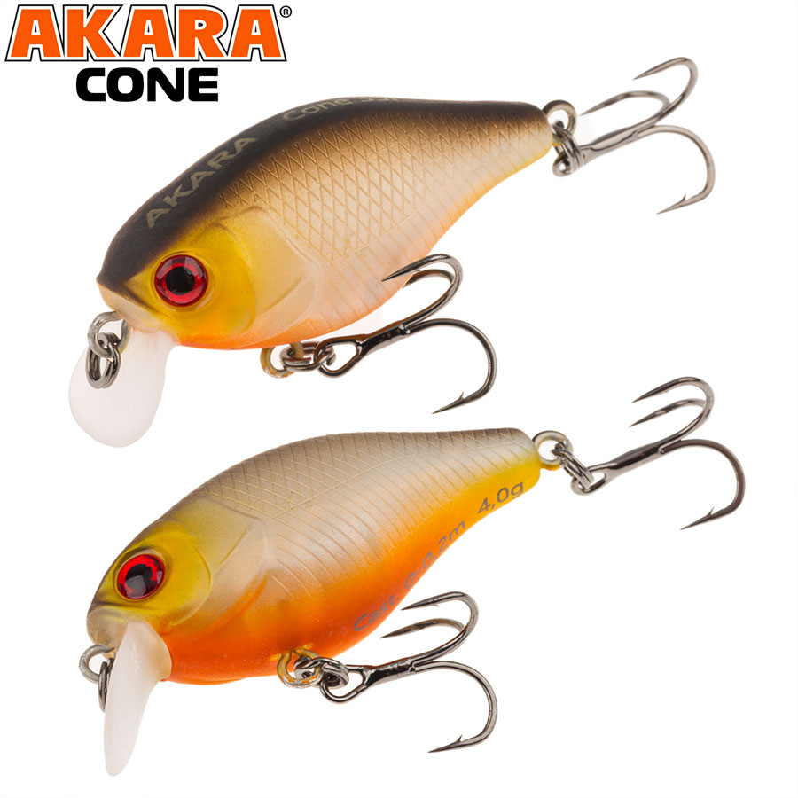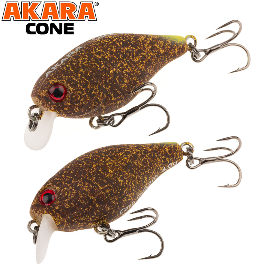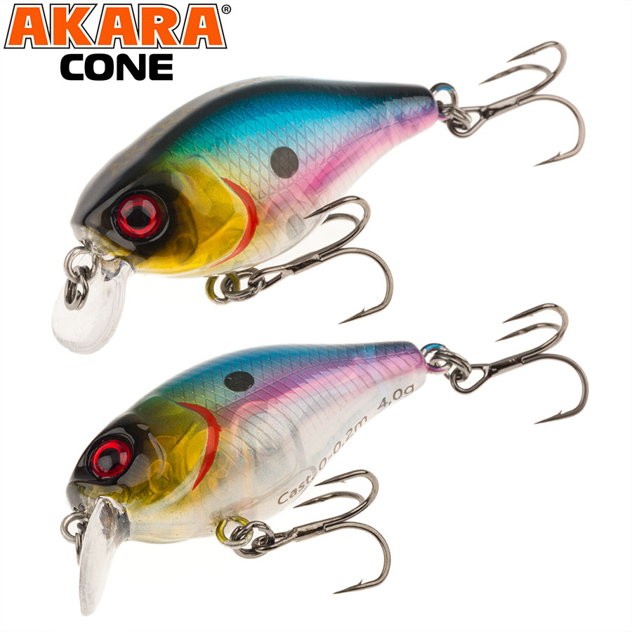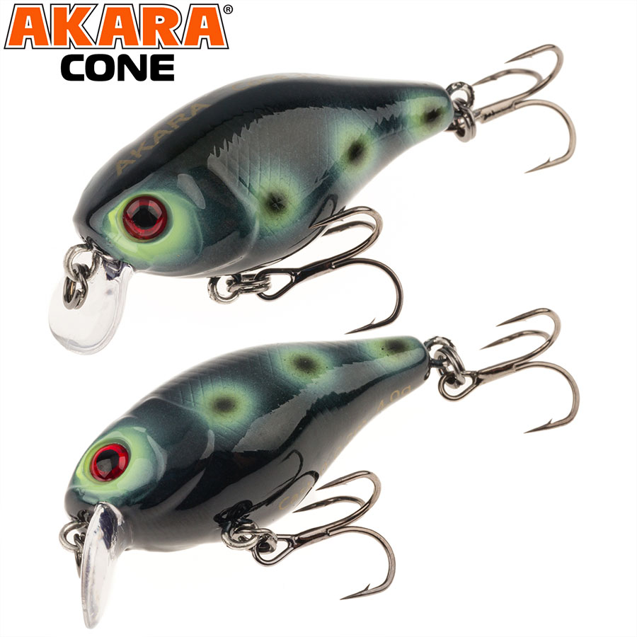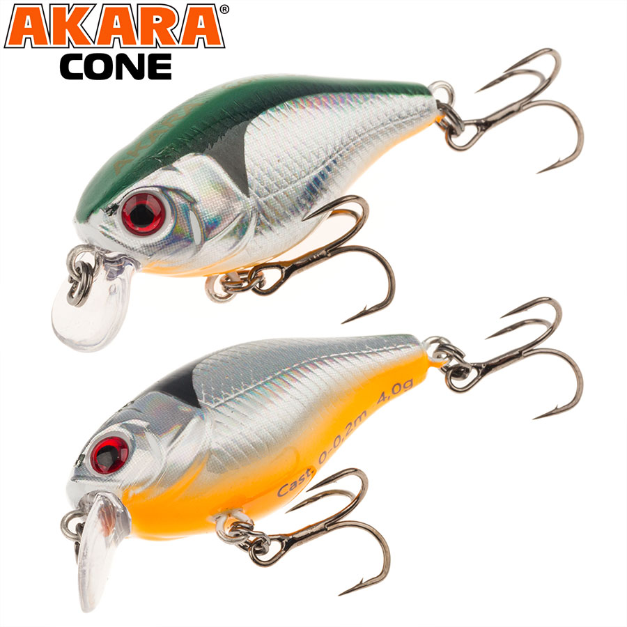 Воблер Akara Cone - классический голавлинный кренк для ловли в подповерхностном слое. Игра у воблера активная. Присутствует шумовой эффект. Лучше всего для данной приманки подходит монотонная равномерная проводка. Хотя и варианты с паузами не исключены. Помимо форели этот воблер будет уместен для ловли прудовой форели. Особенно, когда хищница держится в верхних слоях воды. Плавающий. Акустический. Заглубление при кастинге 0 до 0,2 м.