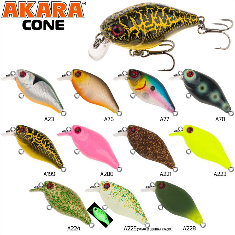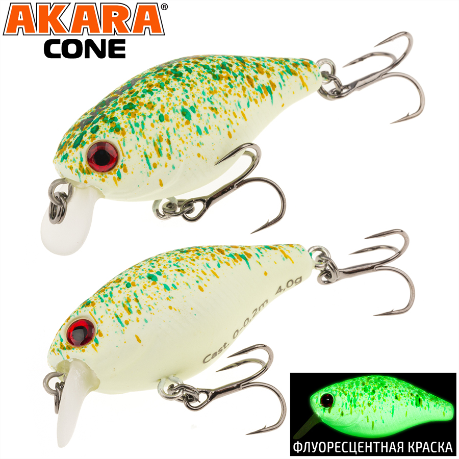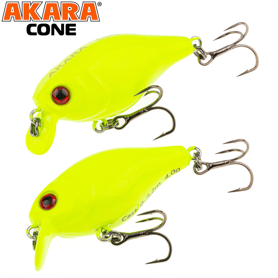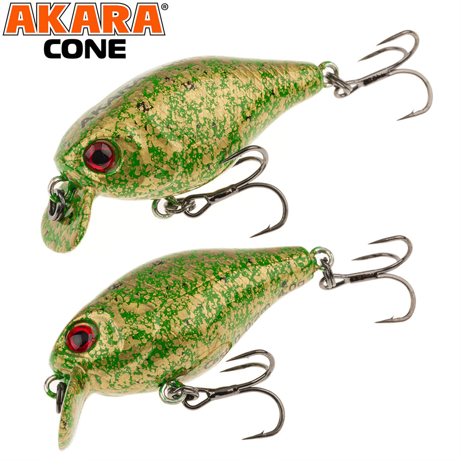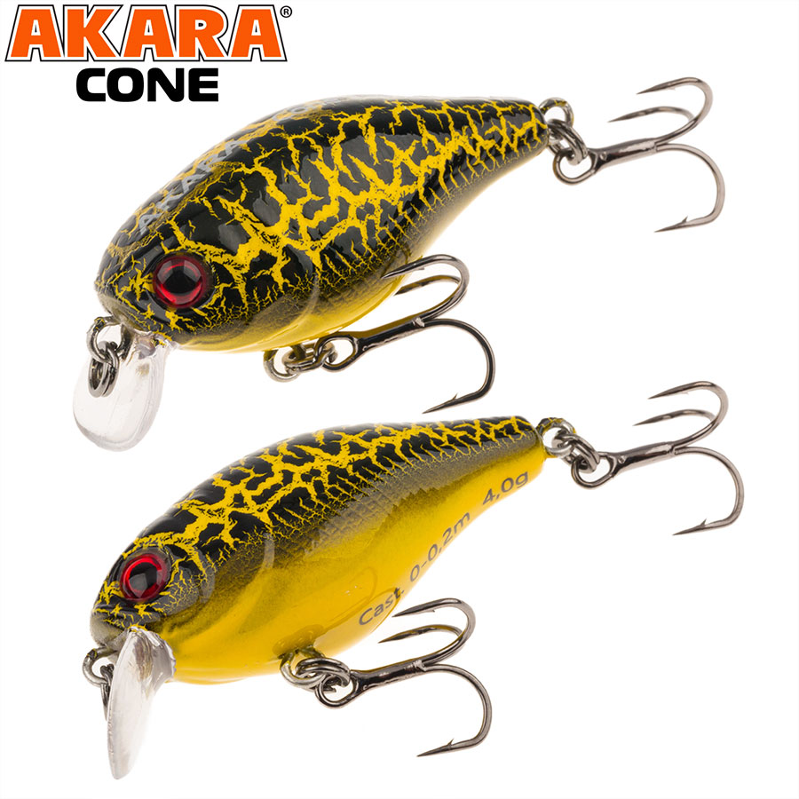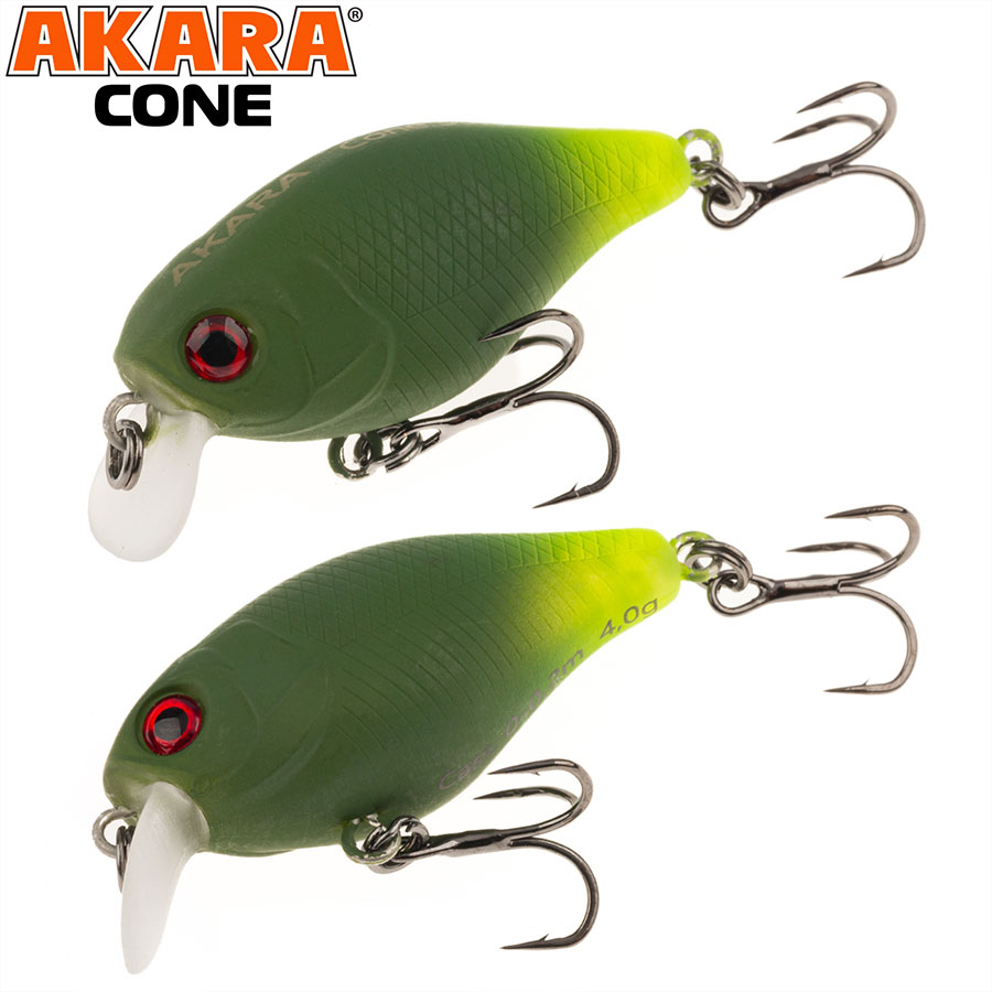 Воблер Akara Cone - классический голавлинный кренк для ловли в подповерхностном слое. Игра у воблера активная. Присутствует шумовой эффект. Лучше всего для данной приманки подходит монотонная равномерная проводка. Хотя и варианты с паузами не исключены. Помимо форели этот воблер будет уместен для ловли прудовой форели. Особенно, когда хищница держится в верхних слоях воды. Плавающий. Акустический. Заглубление при кастинге 0 до 0,2 м.