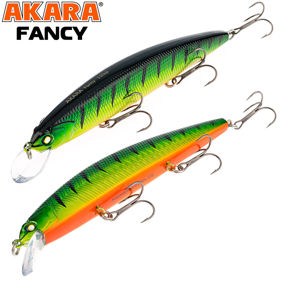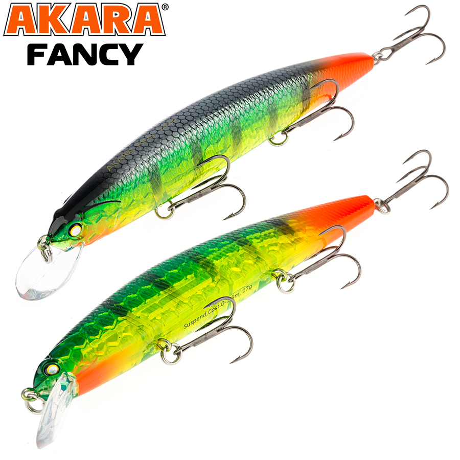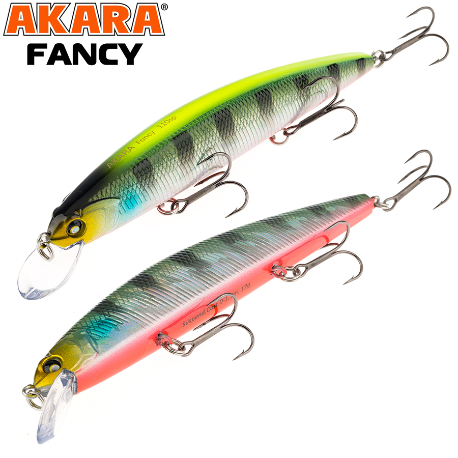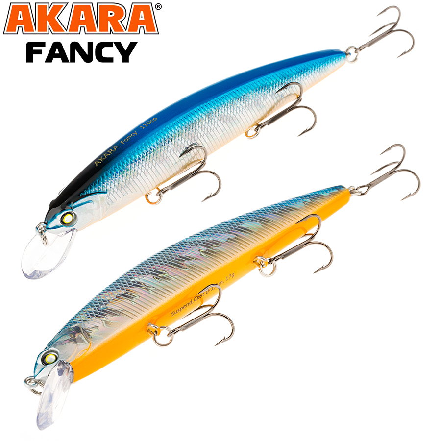 Akara Fancy - классический воблер суспендер для ловли твичингом. Его длина 110 мм с заглублением до 1,5 метров, позволяет ловить щуку и других хищников в типичных местах ловли. При весе 17 грамм, он прекрасно забрасывается и позволяет рыбаку облавливать большие площади. Разнообразные цвета, позволят выбрать приманку для любых условий ловли. Суспендер. Заглубление при кастинге от 0 до 1,5м.