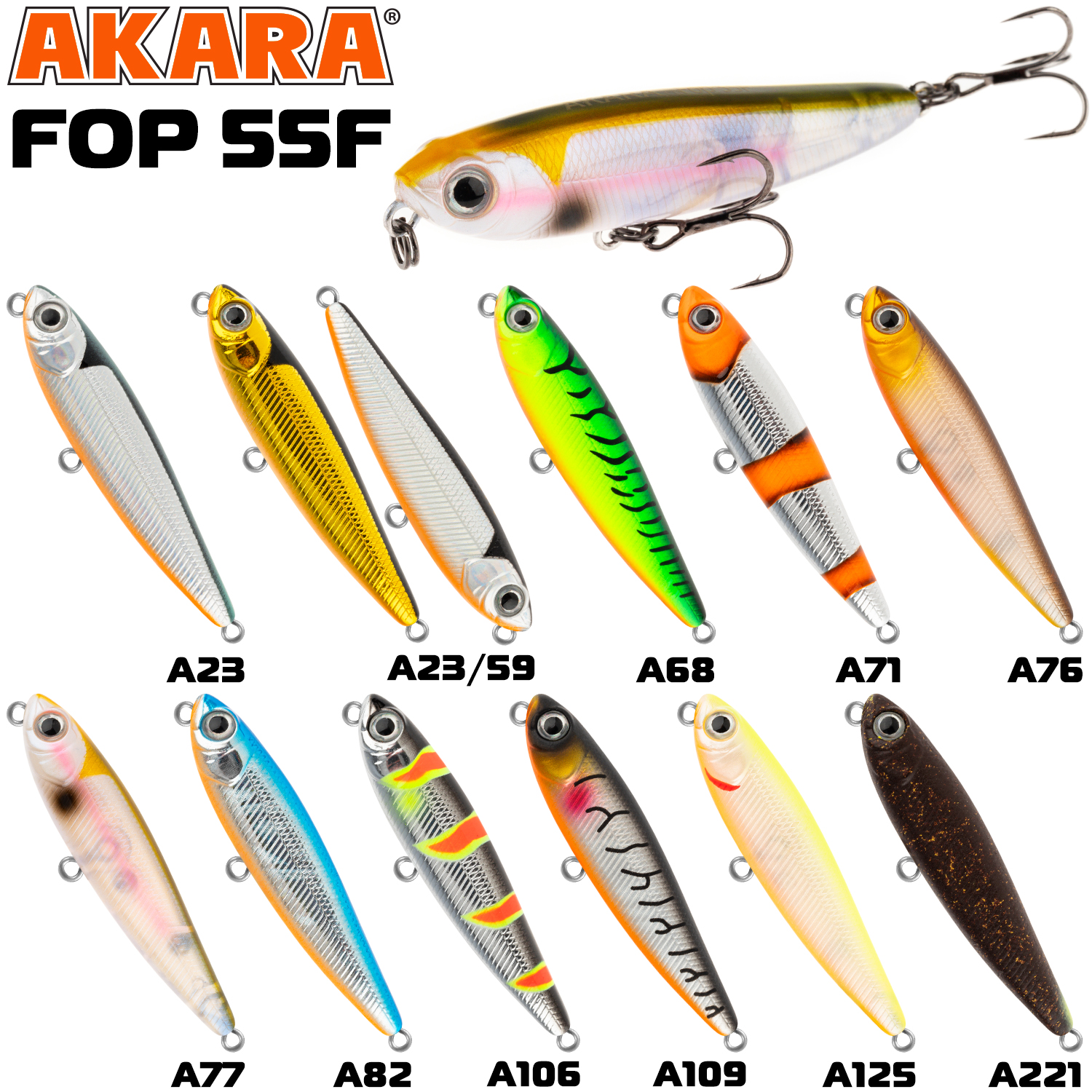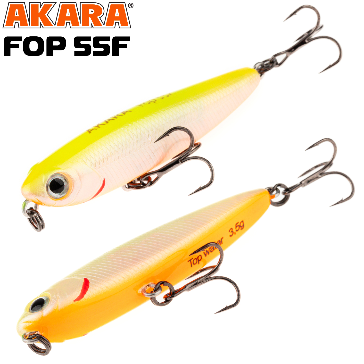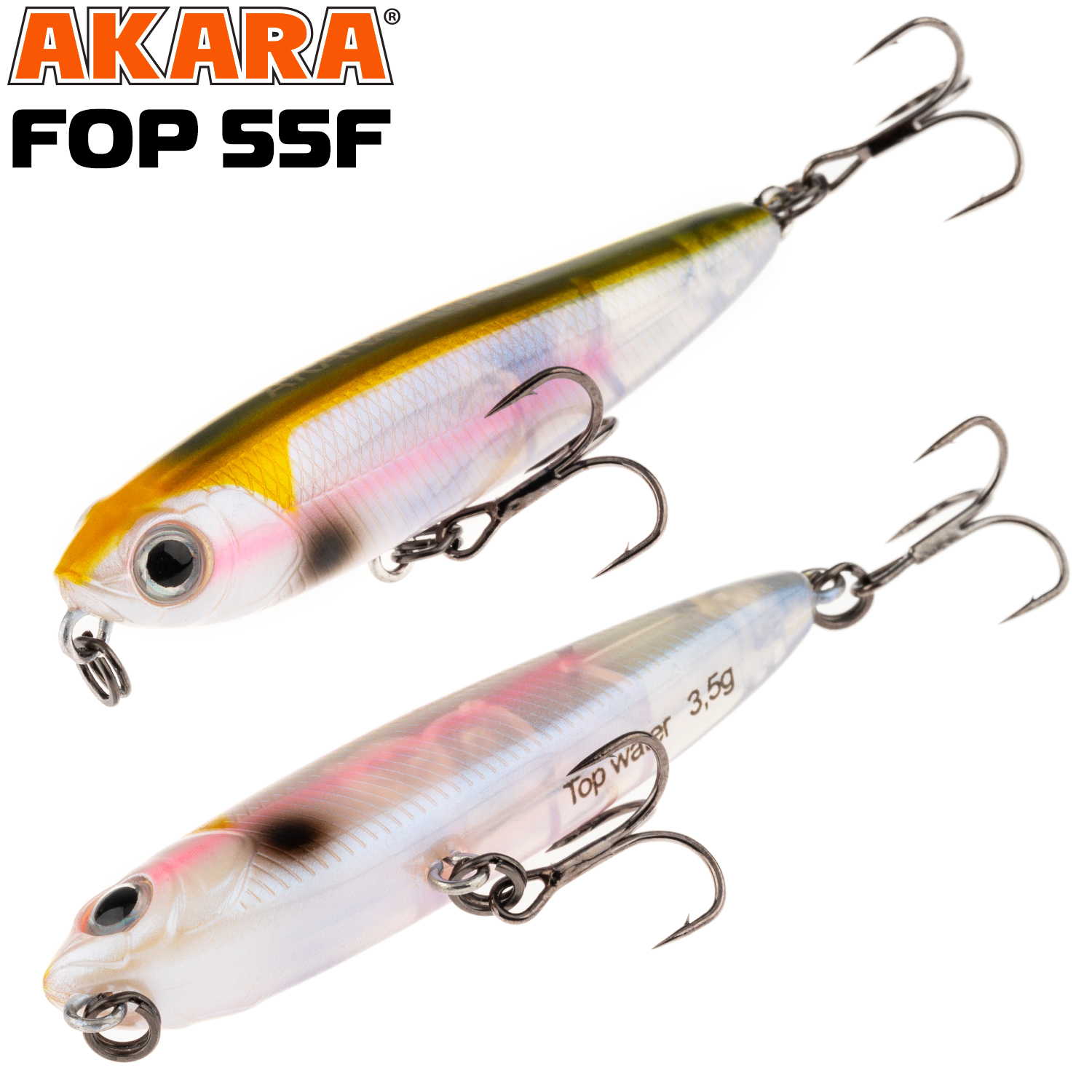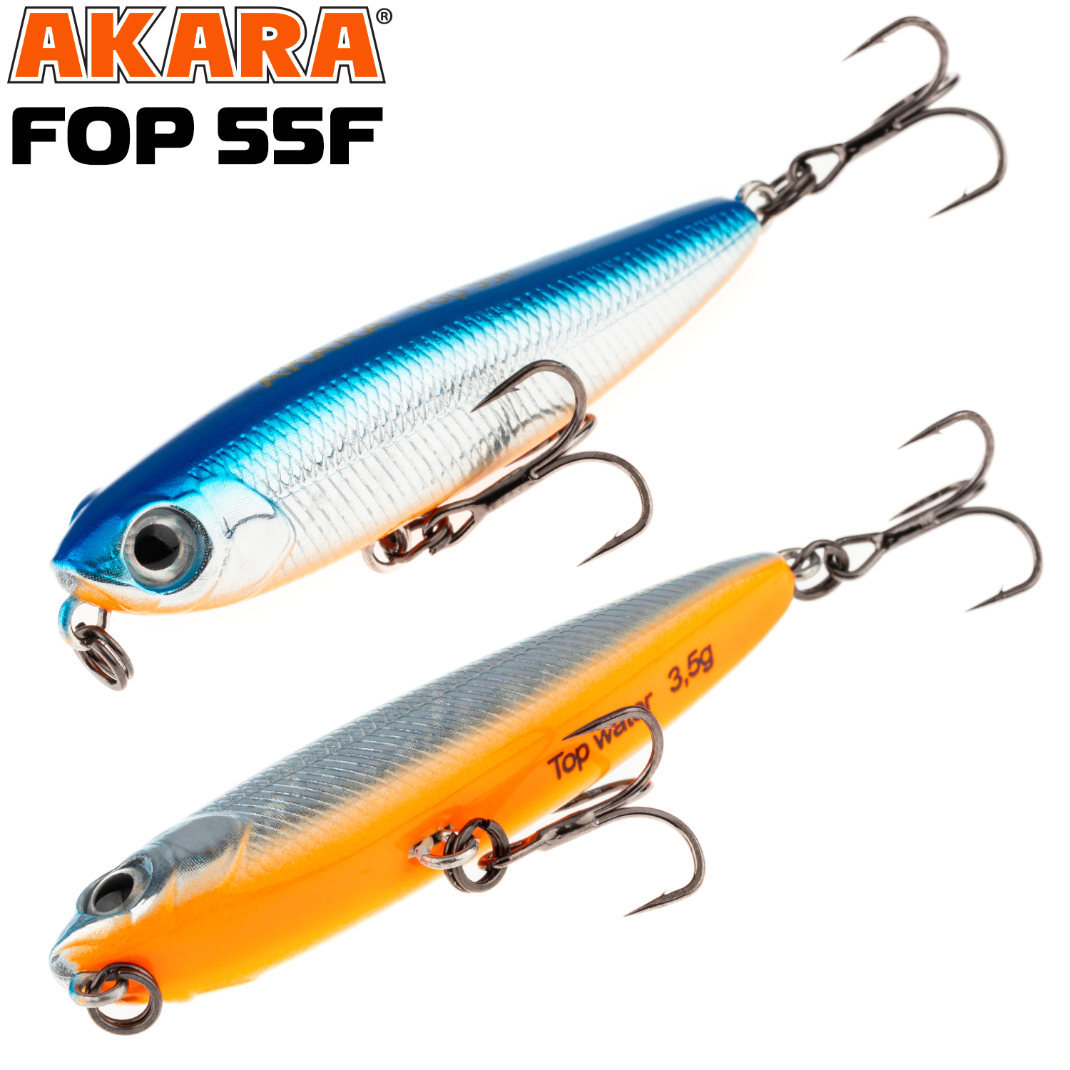 Akara Fop 55F – плавающий волкер длиной 55 мм. Вес 3,5 г. Благодаря компактной торпедообразной форме имеет отличные полетные характеристики. Рекомендуется проводить данный волкер рывковой проводкой. Характерная игра приманки на поверхности воды привлекает рыбу с больших дистанций. Подходит для ловли щуки, окуня, жереха и др. Устойчиво работает на водоемах разных типов. Оснащен крючками из высоколегированной стали. Поверхностный.