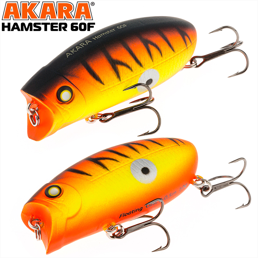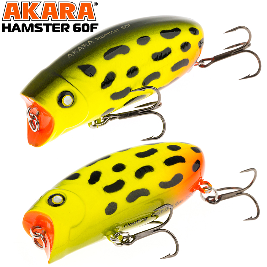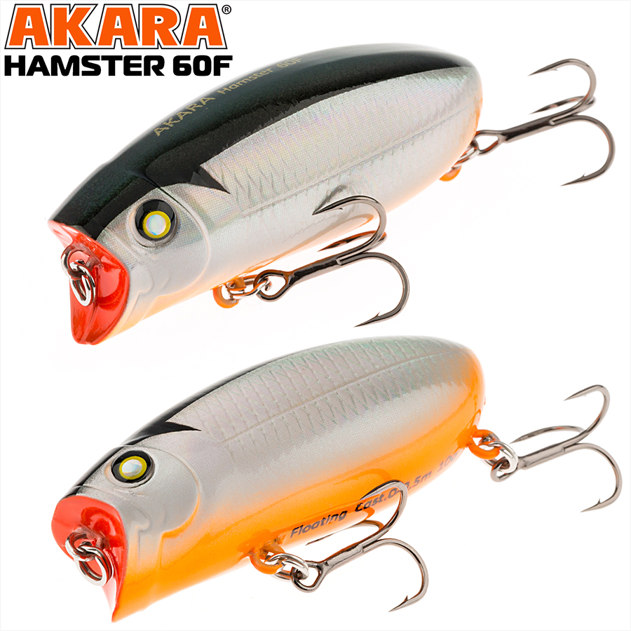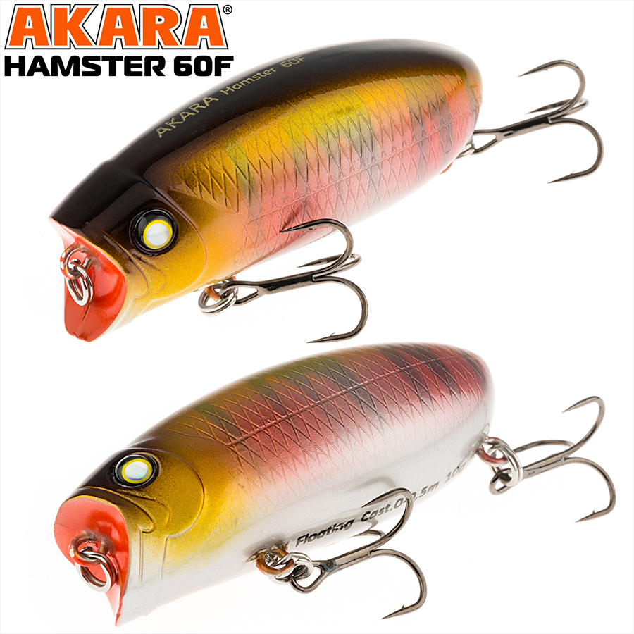 Akara Hamster 60F - воблер, собравший в себе лучшие качества поппера, волкера и подповерхностной приманки. В зависимости от стиля проводки спиннингист контролирует поведение этой приманки на и под водой. При рывковой анимации воблер ведёт себя, как поппер, активно разбрызгивая воду и создавая привлекательные для хищника звуки. При этом приманка идет из стороны в сторону, оставляя на поверхности воды характерные усы. При равномерной проводке воблер может заглубляться до 30 см, игра активная с ярко выраженными движениями вокруг своей оси. Отличная приманка для ловли щуки, окуня и других хищников в ограниченных условиях сложных водоемов. Плавающий. Акустический. Заглубление при кастинге 0 до 0,5 м.