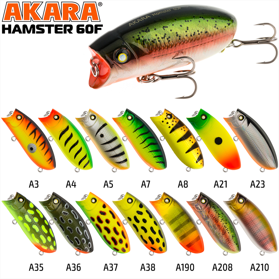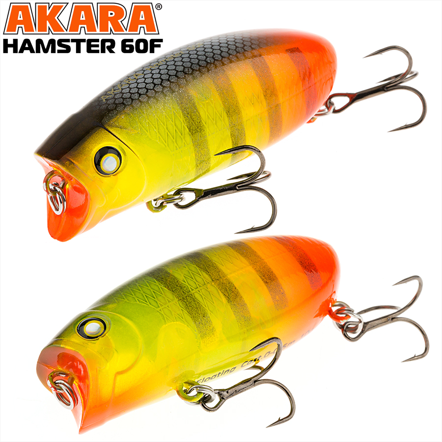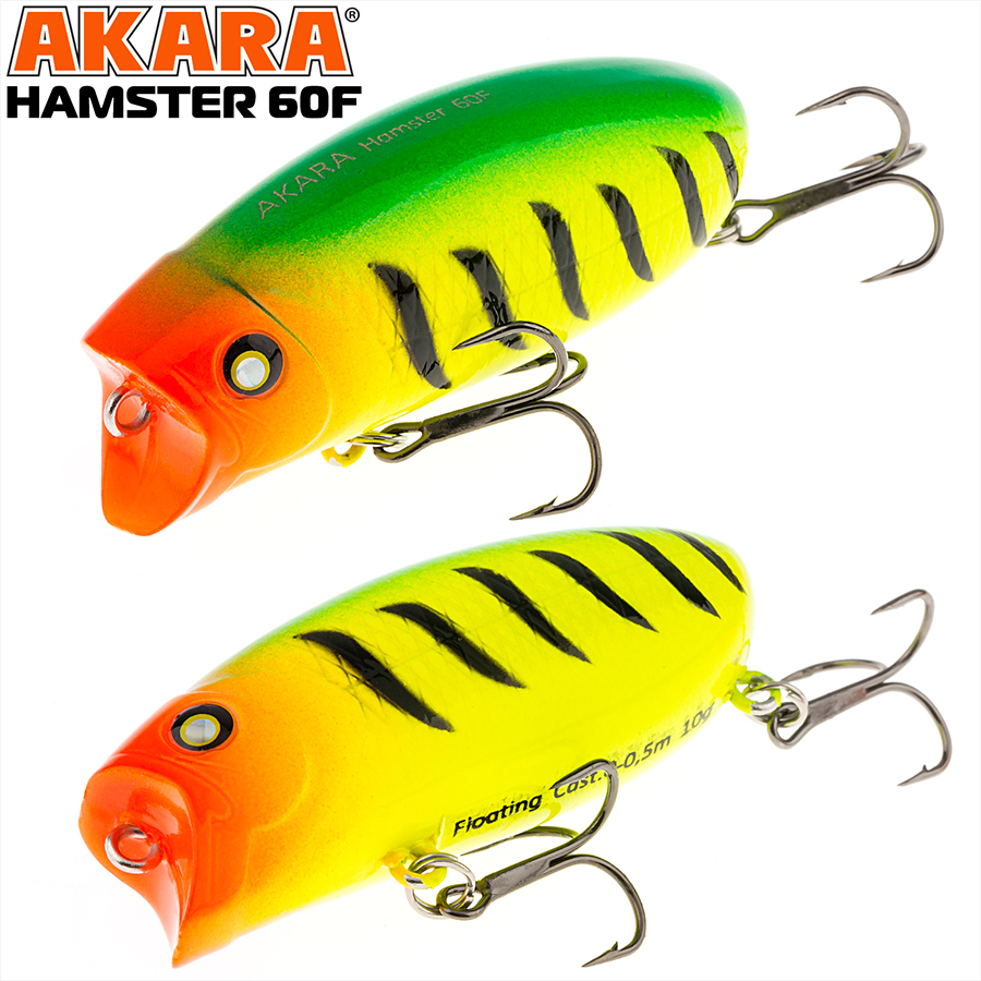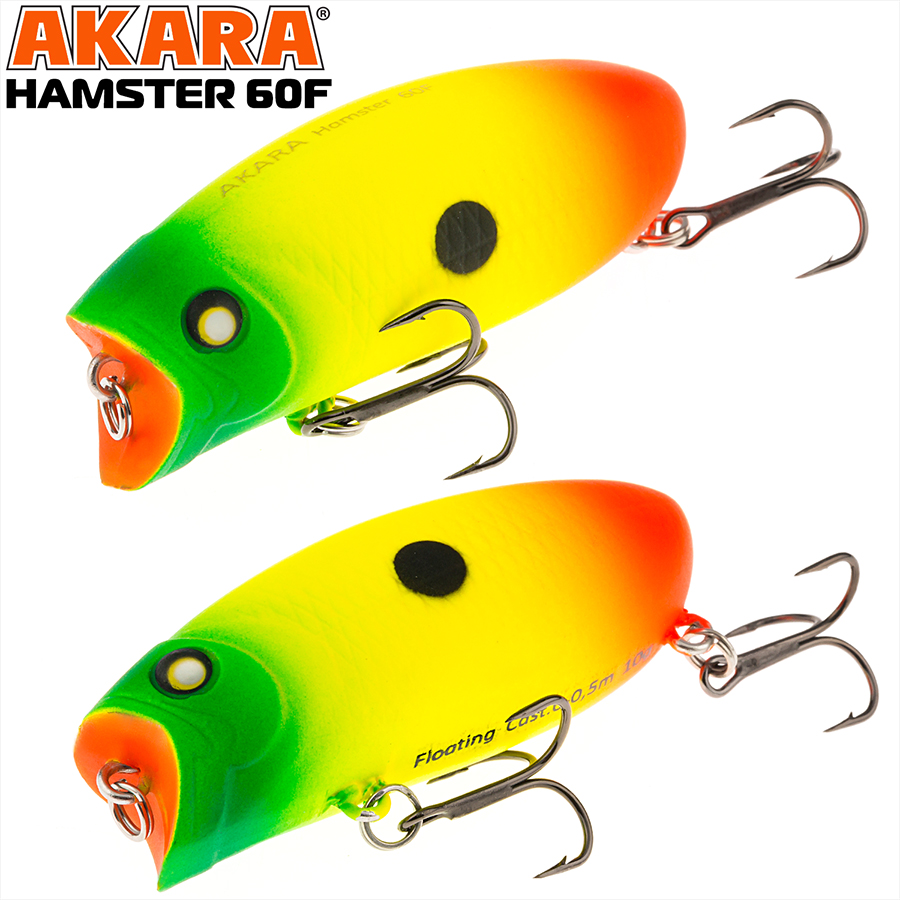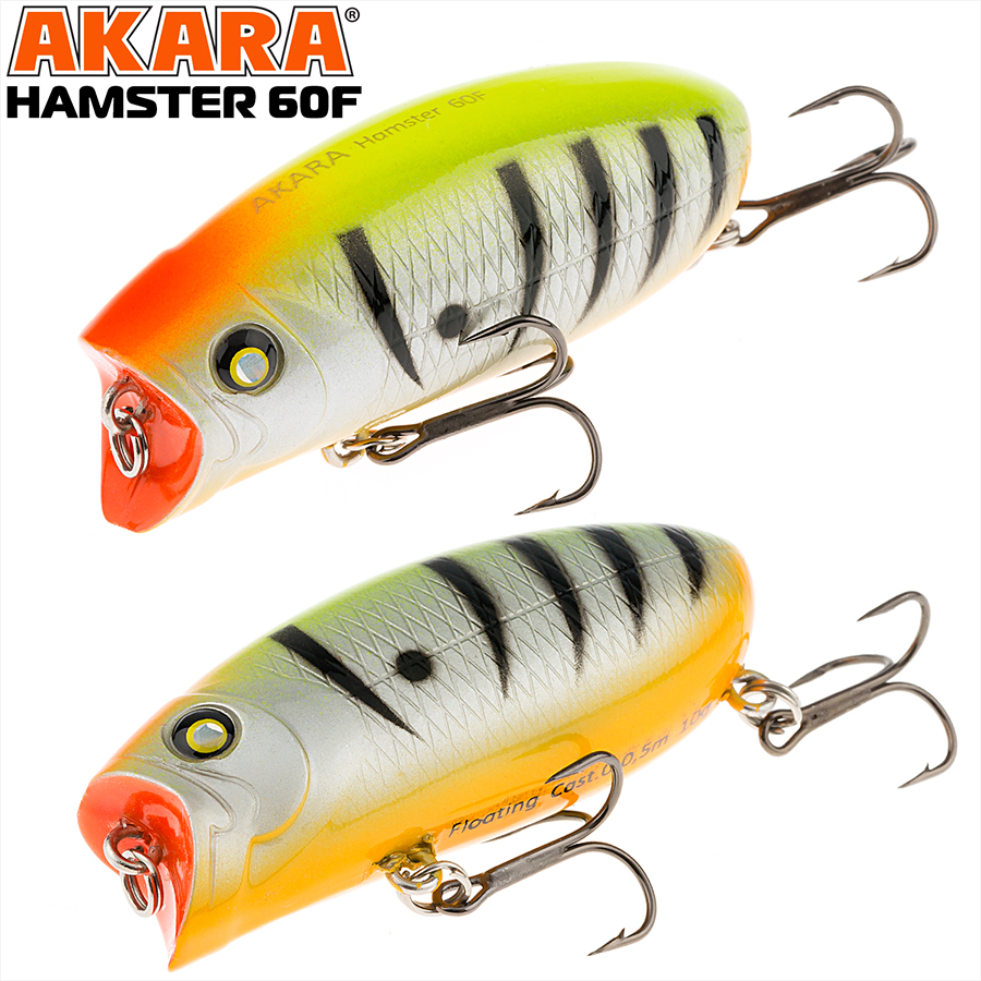 Akara Hamster 60F - воблер, собравший в себе лучшие качества поппера, волкера и подповерхностной приманки. В зависимости от стиля проводки спиннингист контролирует поведение этой приманки на и под водой. При рывковой анимации воблер ведёт себя, как поппер, активно разбрызгивая воду и создавая привлекательные для хищника звуки. При этом приманка идет из стороны в сторону, оставляя на поверхности воды характерные усы. При равномерной проводке воблер может заглубляться до 30 см, игра активная с ярко выраженными движениями вокруг своей оси. Отличная приманка для ловли щуки, окуня и других хищников в ограниченных условиях сложных водоемов. Плавающий. Акустический. Заглубление при кастинге 0 до 0,5 м.