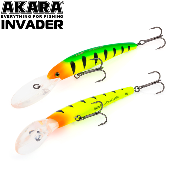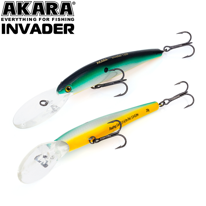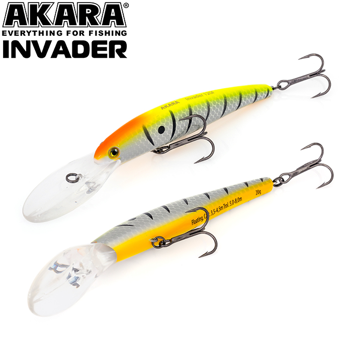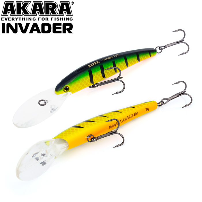 Invader 120F - воблер для ловли на средних и больших глубинах. Обладает характерной рыскающей игрой, что вкупе с шумовым эффектом показывает отличные результаты при ловле щуки, сома и крупного судака. Плавающий. Акустический.Заглубление при кастинге от 3,5 до 4,5 м, при троллинге от 5,0 до 8,0 м.