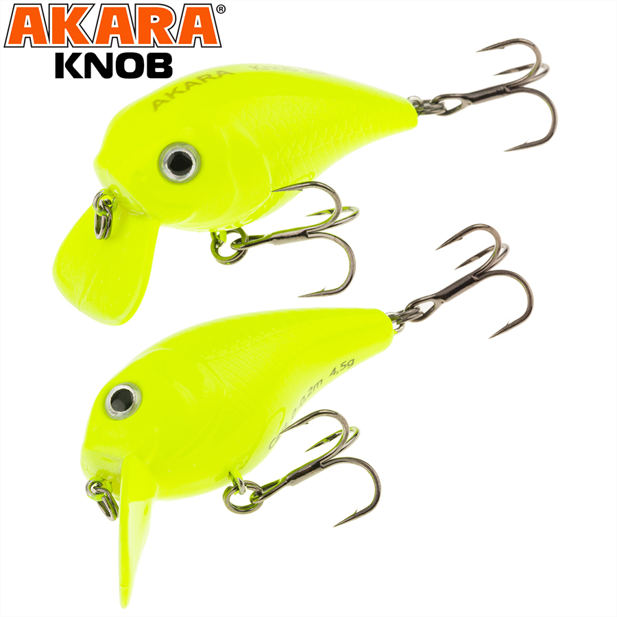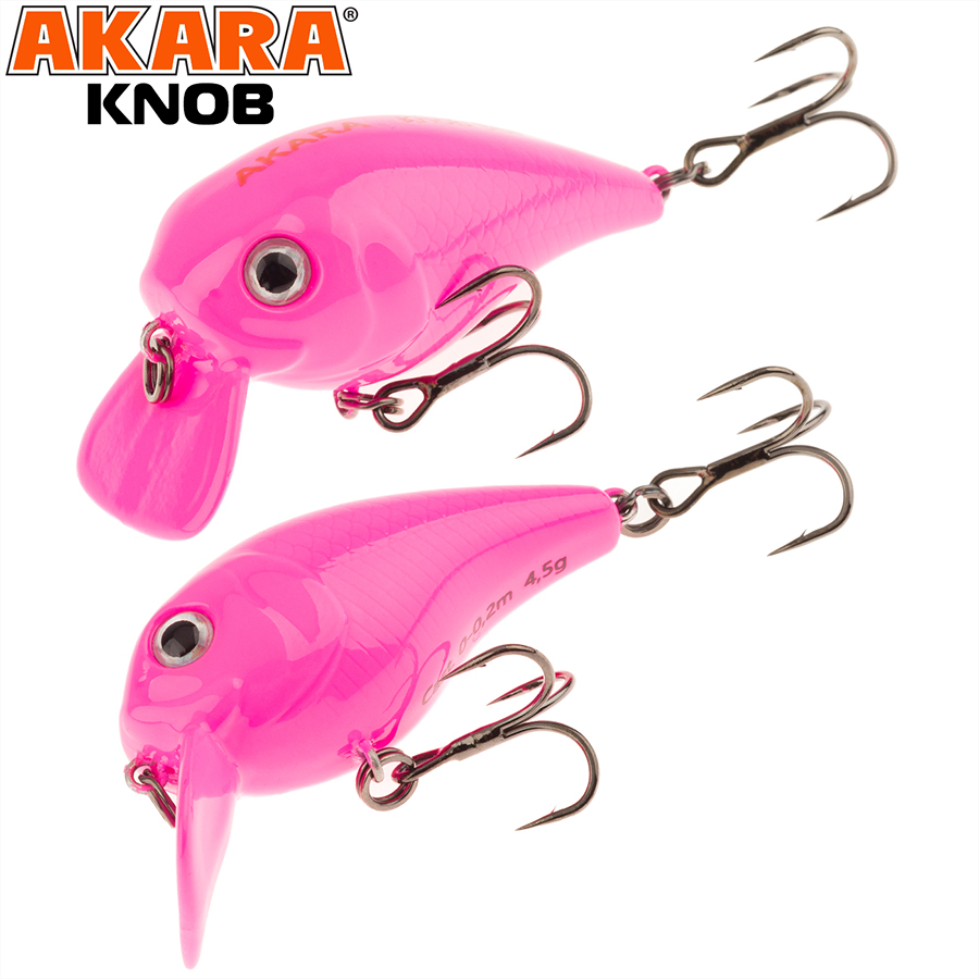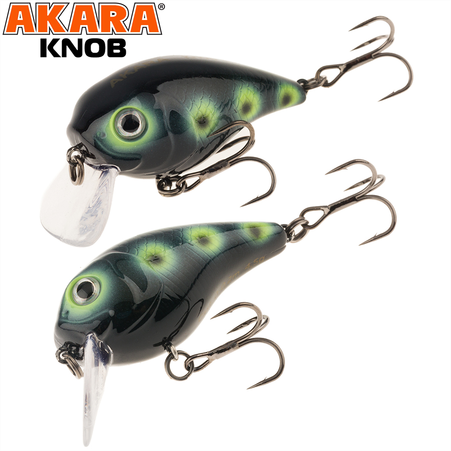 Воблер Akara Knob - упитанное тело воблера и широкая лопата сразу выдают в нем голавлинный кренк. Воблер отлично держит струю и хорошо подходит для ловли на течении. При быстрой проводке приманка полностью заглубляется в подповерностном слое. При медленной проводке приманка играет на самой поверхности оставляя за собой хорошо выраженные усы. Дополнительно воблер обладает шумовым эффектом. Помимо ловли голавля Akara Knob хорошо подойдёт для ловли прудовой форели при ее активности в верхних слоях воды. Плавающий. Акустический. Заглубление при кастинге 0 до 0,2 м.