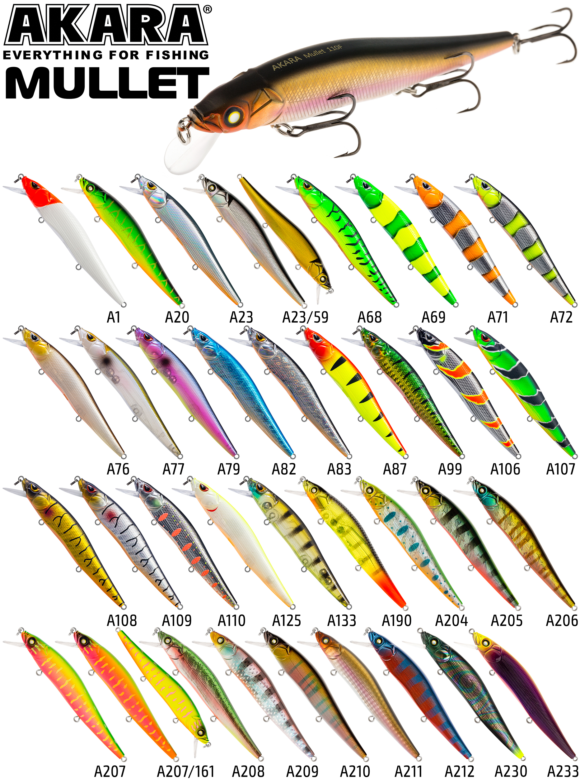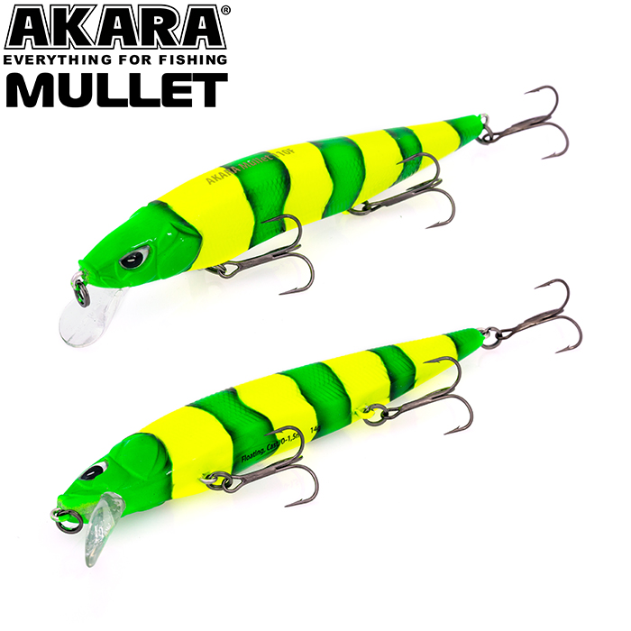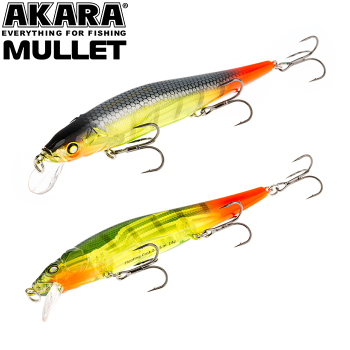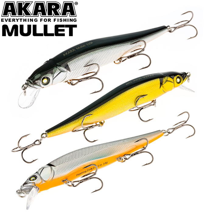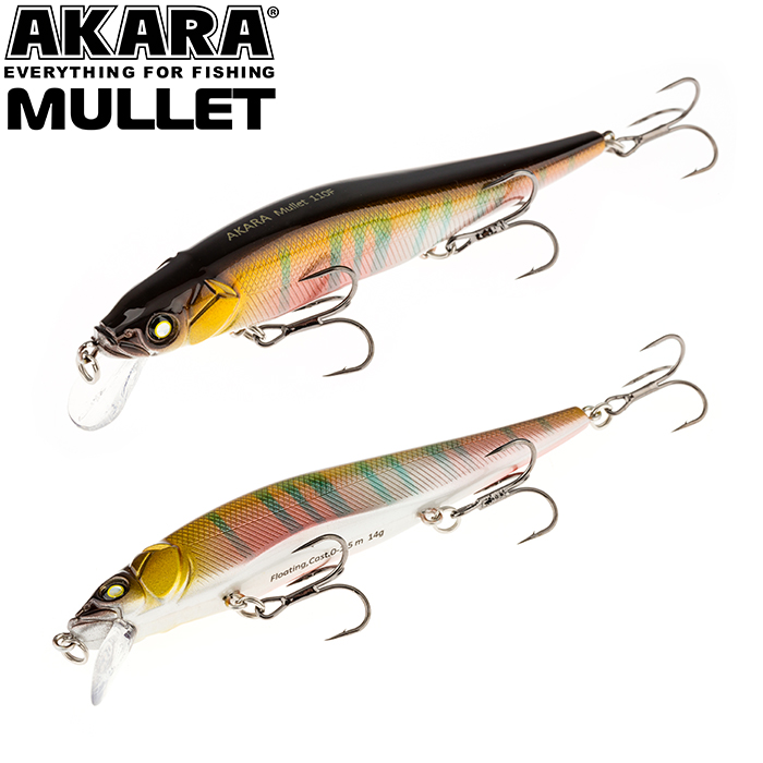 Mullet 110F - плавающий воблер класса миноу для ловли твичингом. Лучшей аннимацией являются резкие рывки с короткими паузами. Отлично показал себя при ловле щуки на небольших глубинах, а так же судака на мелководье в вечернее время. Акустический. Кастинг 0 до 1,5 м.