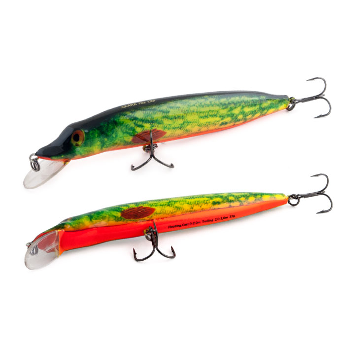 Pike - оригинальная, популярная модель для ловли щуки. Воблер в размере 130 мм успешно применяется при троллинге на малых глубинах, а приманки меньших размеров 90 и 110 мм можно использовать в заброс и при агрессивном твиче. Плавающий. Акустический. Заглубление при кастинге 0 до 1,5 м, при троллинге 1,5 до 2,5 м.