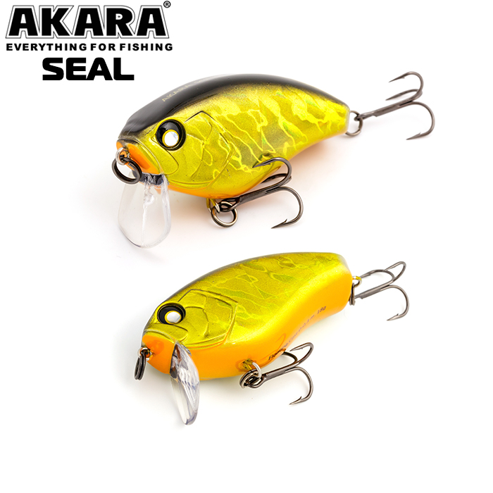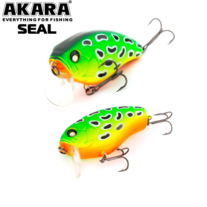 Akara Seal 60F - воблер класса крэнк. Это довольно крупная подповерхностная приманка с очень активной игрой. Отлично подходит для ловли щуки на больших мелководных поливах, где трава порой доходит почти до самой поверхности. Приманка создаёт сильные колебания при проводке, которые рыба может почувствовать с большого расстояния даже через густую растительность. Внутри воблера расположена металлическая капсула с шариком, который перекатывается из стороны в сторону и создаёт громкий, далеко слышный звук, способный расшевелить самого неактивного хищника. Основной способ проводки, это - равномерная проводка или проводка с паузами, которую можно разнообразить лёгкими подёргиваниями. Главным объектом ловли является щука. Акустический. Плавающий. Кастинг 0 до 1,5 м.