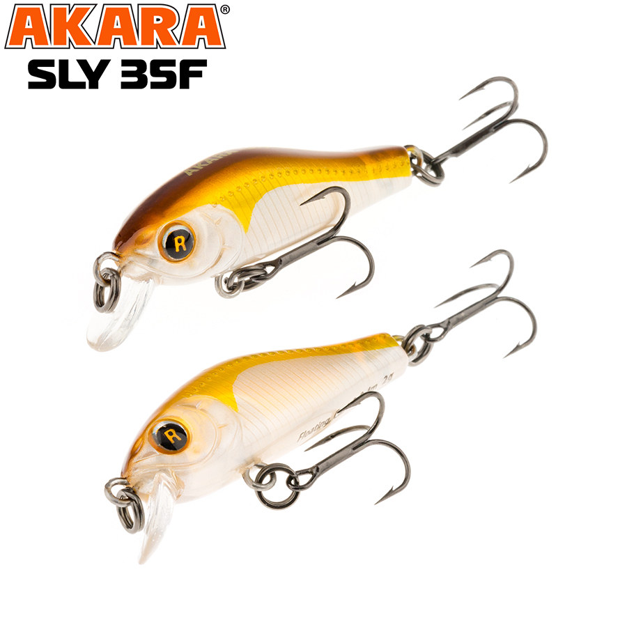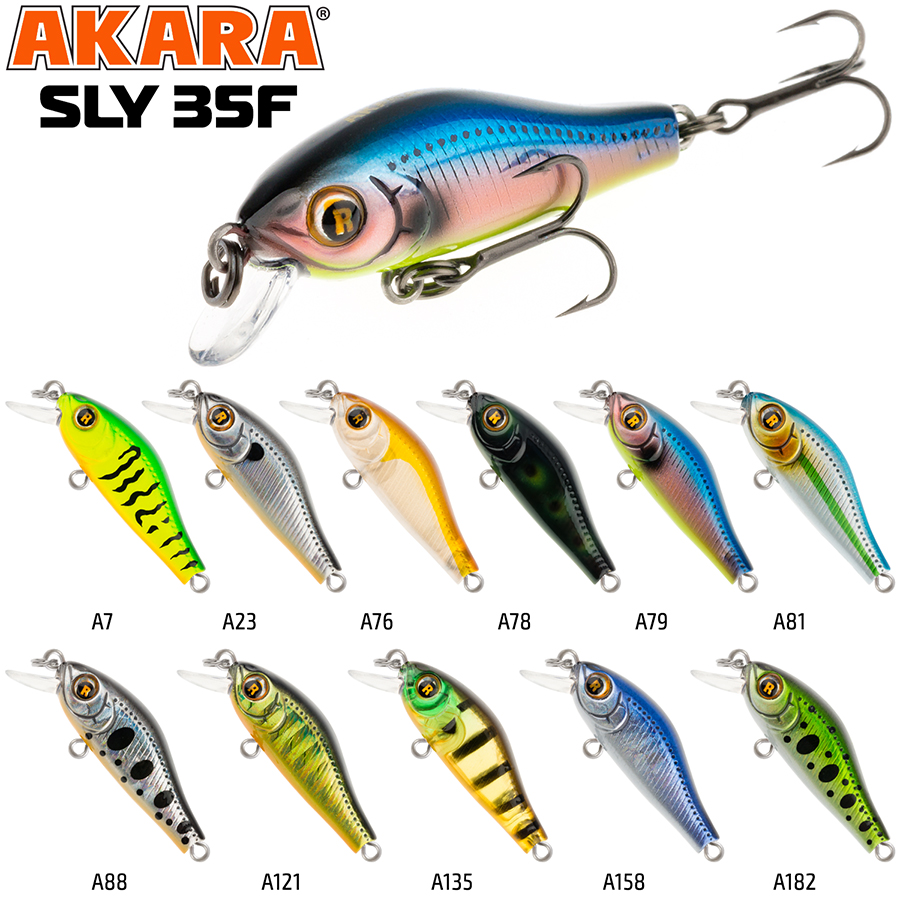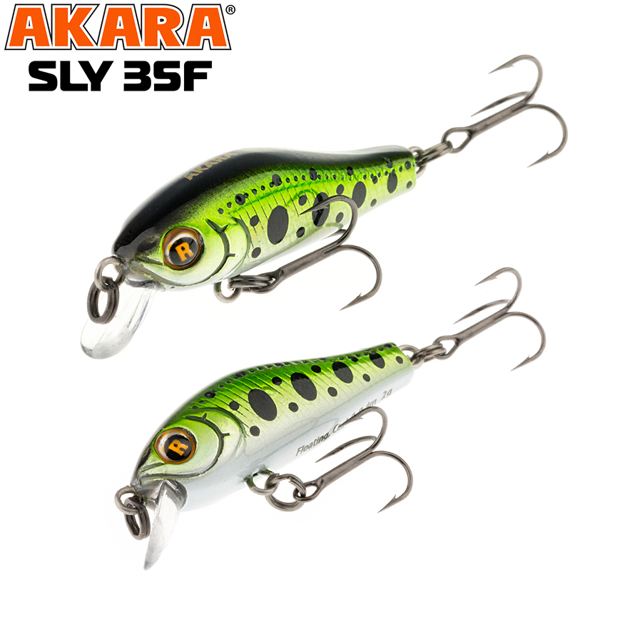 Воблер Akara Sly 35F - является классикой голавлиной рыбалки. Он отлично держит струю. Четкие колебания воблера на равномерной проводке не могут оставить голавля равнодушным, и он атакует приманку, даже если сегодня сыт. С этой приманкой возможна и рывковая анимация. Хаотичные движения воблера придутся по вкусу форели, окуню и другим хищникам. Воблер Akara Sly 35F плавающий, поэтому при ловле на течении, его можно легко сплавлять под нависающие кусты, в тени которых очень часто поджидает свою добычу хищник. Плавающий. Кастинг 0 до 0,4 м.