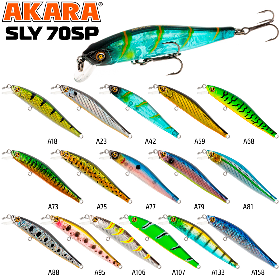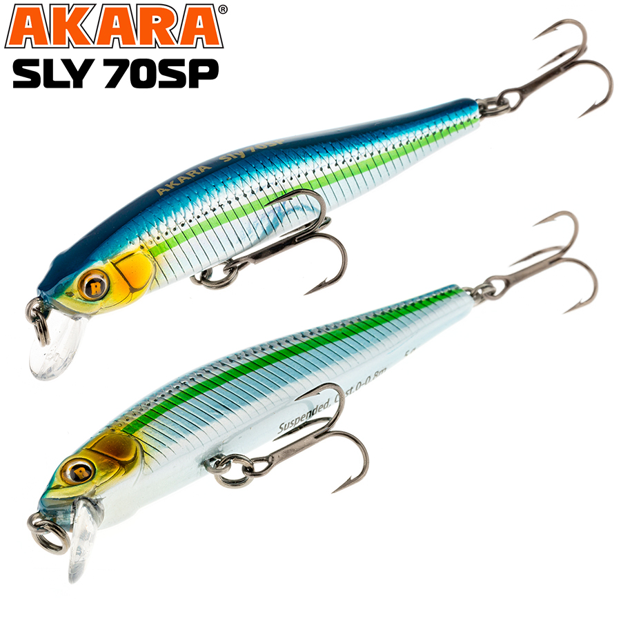 Akara Sly 70SP - это классика твичинга. Идеально работает на любой рывковой проводке. На резких и агрессивных рывках воблер идет в 30-40 см от поверхности воды, а на плавных и протяжках его можно заглубить до одного метра. Нейтральная плавучесть делает эту модель неотразимой на паузах. При этом надо понимать, что с металлическим поводком воблер будет слабо погружаться, что впрочем, часто является дополнительным раздражением для хищника. Если же тройники поменять на более легкие, то воблер будет медленно всплывать, давая возможность сделать деликатную проводку над подводными зарослями, где часто прячется хищник. Металлические шарики в корпусе воблера создают при проводке акустический эффект, делая приманку более заметной добычей. Суспендер. Кастинг 0 до 0,8 м.