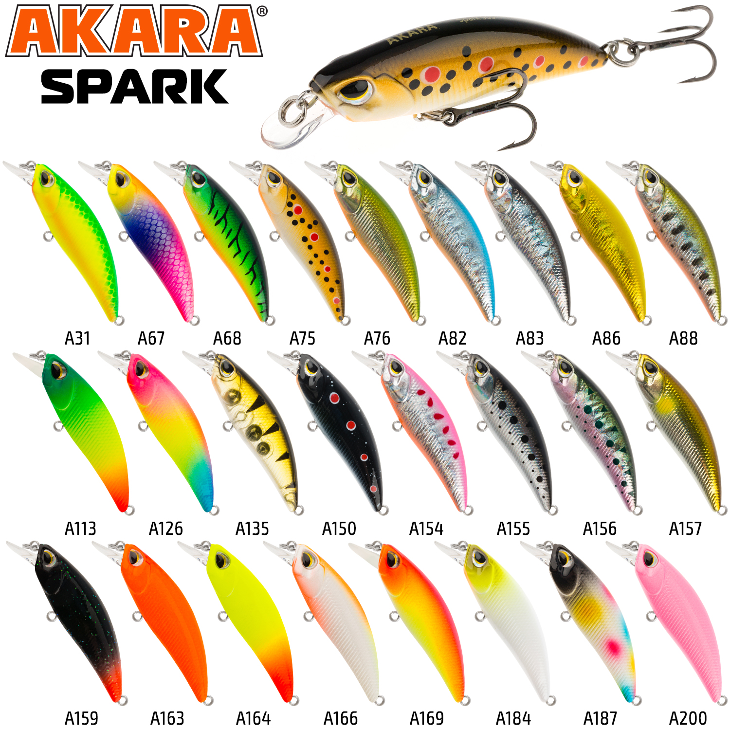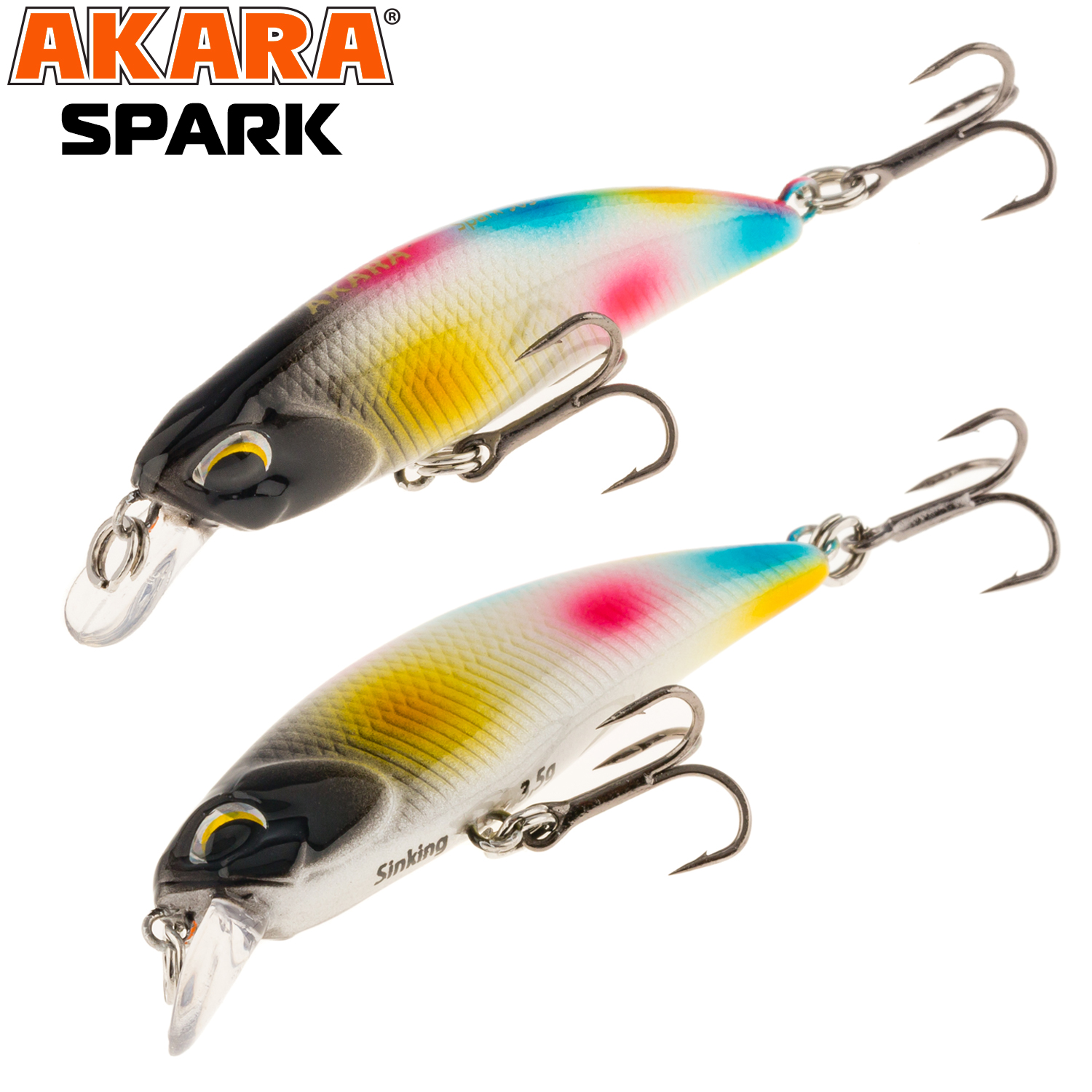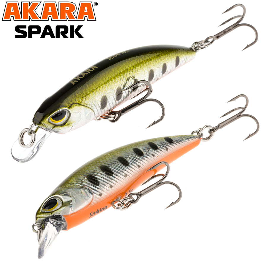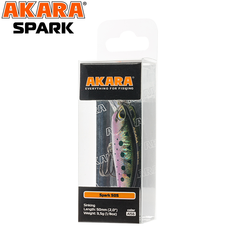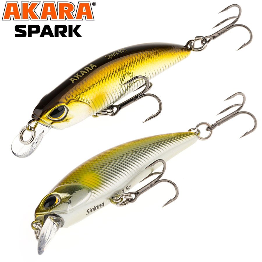 Akara Spark 50S - тонущий воблер типа минноу. Предназначен главным образом для ловли твичингом на течении. Хорошо держит струю и позволяет облавливать разные горизонты. При резких движениях поднимается выше к поверхности, а при плавных потяжках идет ближе ко дну. По мимо ловли на реках Akara Spark 50S занял достойное место и при ловли на стоячих водоемах. Благодаря небольшому обтекаемому телу воблер имеет небольшое сопротивление при забросе и позволяет его закинуть на значительное расстояние. Тонет воблер довольно быстро, поэтому им комфортно будет ловить на глубинах до трех метров. И, не смотря на его небольшой размер, его трофеем может оказаться крупный хищник. Металлические шарики в корпусе воблера создают при проводке акустический эффект, делая приманку более заметной добычей.