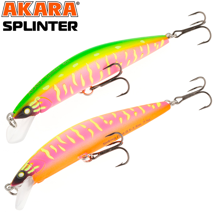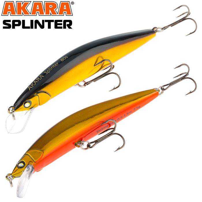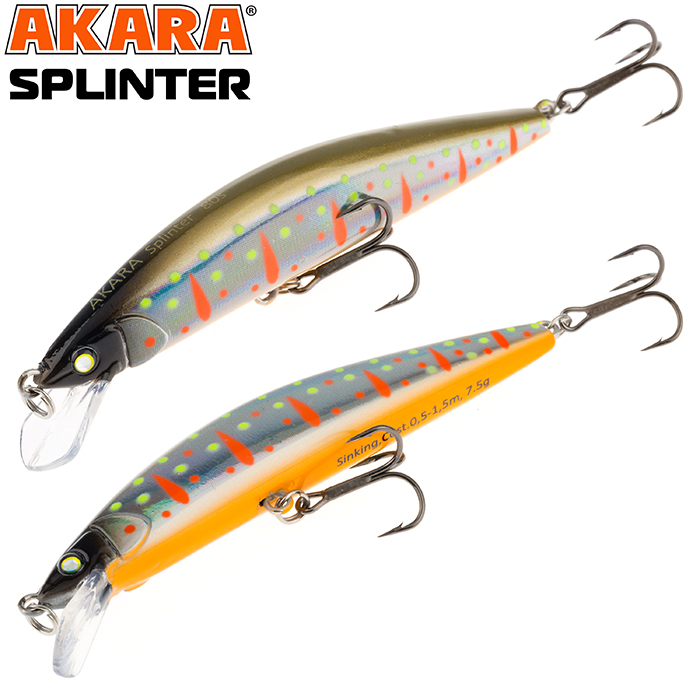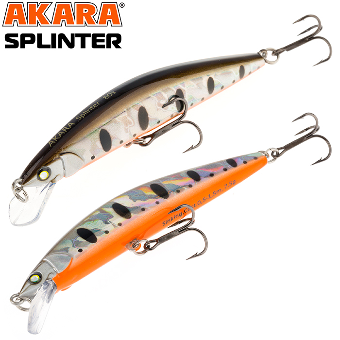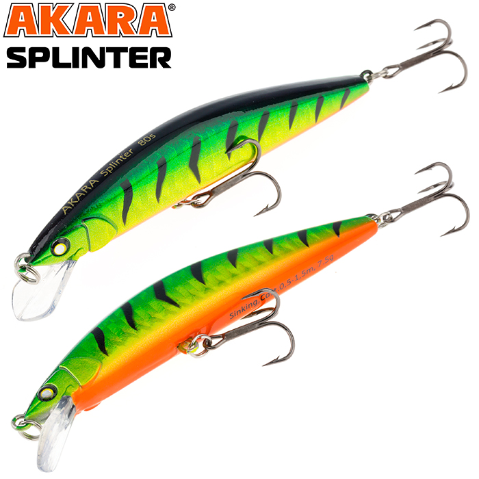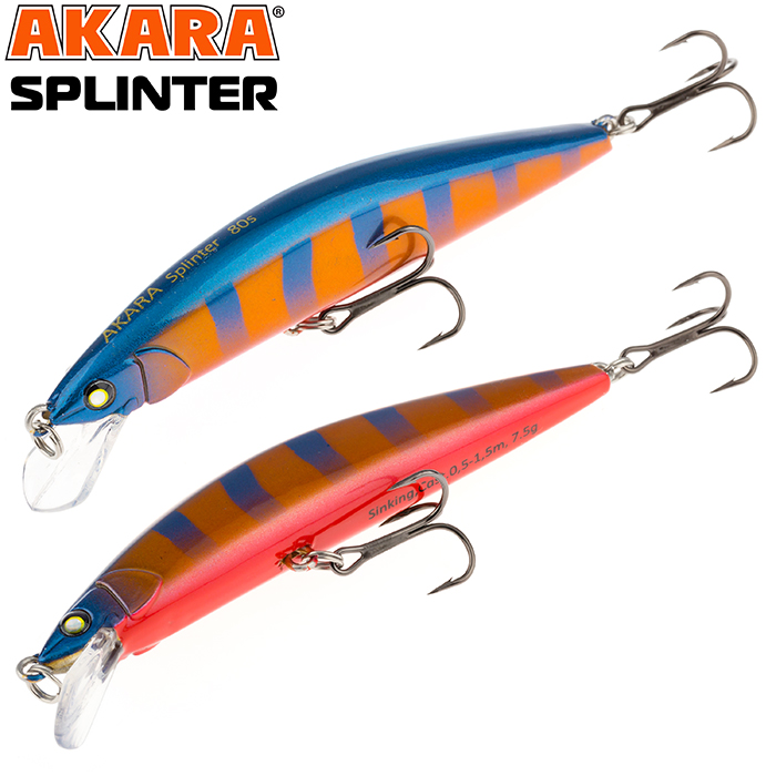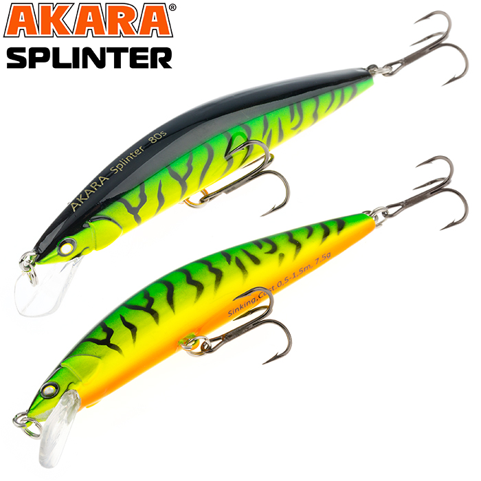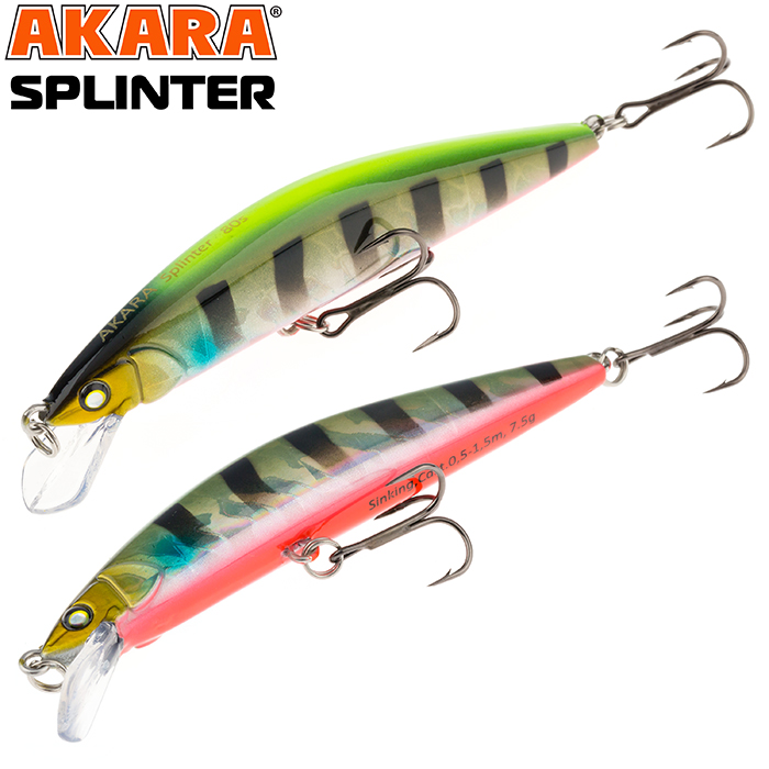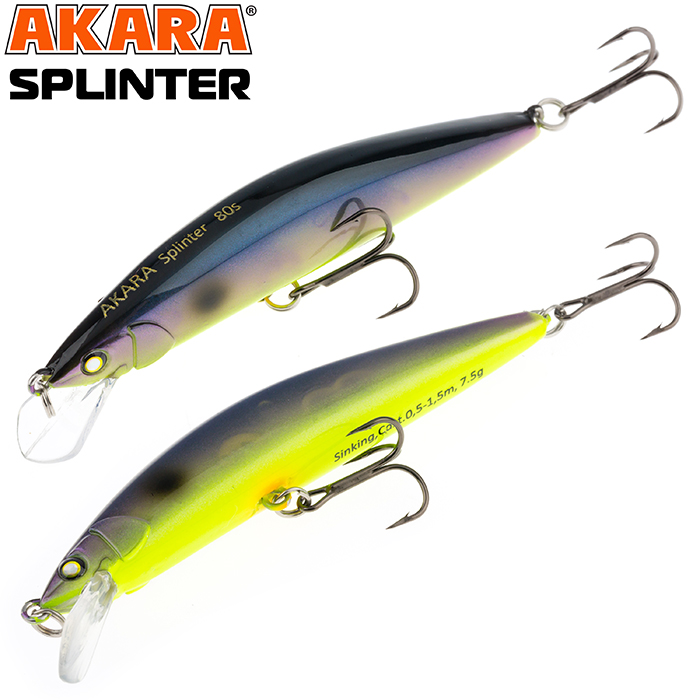 Akara Splinter - воблер класса минноу. Прекрасно подходит для твичинговой ловли. На равномерной проводке, имеет высокочастотную игру, которая отлично провоцирует рыбу к атаке. Благодаря компактной форме и весу, воблер очень хорошо летит, что позволяет осуществлять дальние забросы. Рекомендуется для ловли судака, окуня, щуки и других хищников. Тип плавучести - тонущий (S). Воблеры выполнены в двух размерах: 65мм - 5г, 80мм - 7,5г.