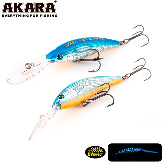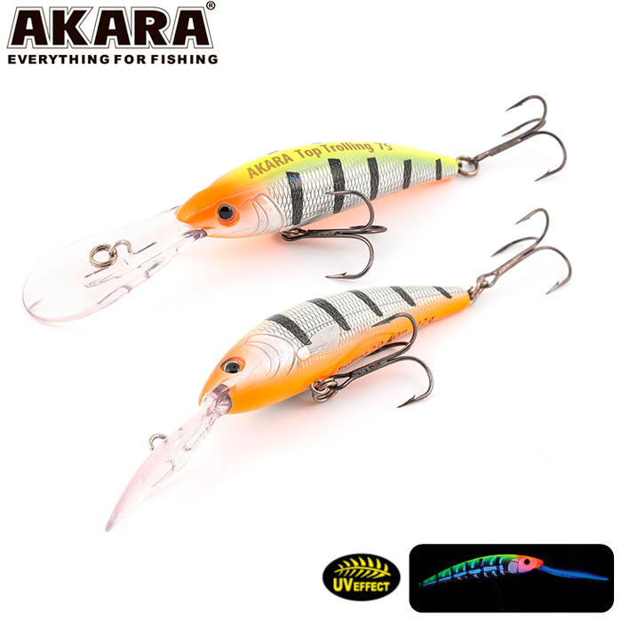 Воблер Akara Top Trolling - плавающая модель, выпускается в трех размерах 75, 90 и 110 мм. Игра воблера зависит от скорости проводки. При медленной игре воблер переваливается с боку на бок, данная проводка провоцирует осторожного хищника на поклевку. При быстрой проводке воблер показывает активную размашистую игру с высокой частотой и средней амплитудой колебаний, такая проводка привлекает активного хищница. Плавающий. Акустический. Заглубление 75 мм - 4,5 м, 90 мм - 6 м, 110 мм - 7,5м.