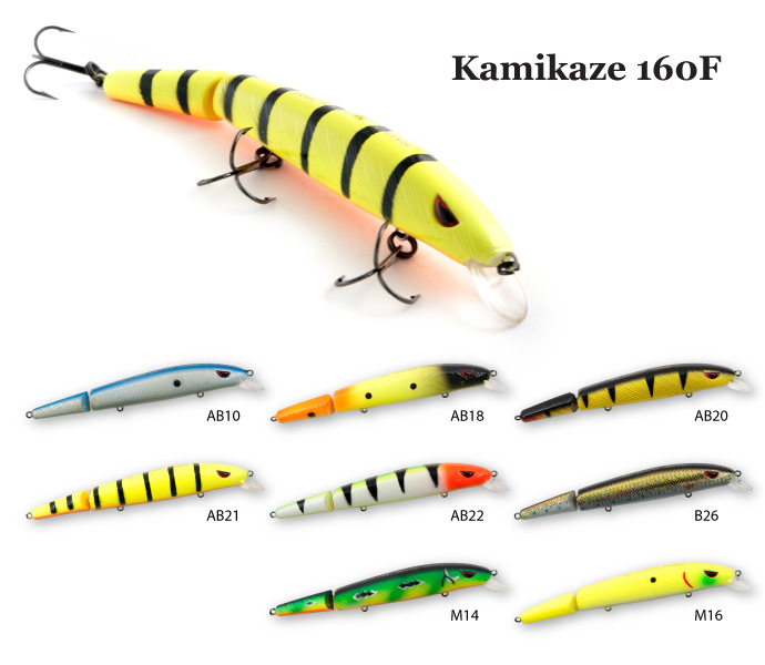 Двухсоставная, приманка большого размера с положительной плавучестью. За счет оригинальной конструкции тела с длинной передней частью и маленьким подвижным хвостом, приманка обладает мощной, интенсивной игрой, привлекая крупного хищника с большого расстояния. Две аккустические камеры с шариками разного калибра создают сильнейший шумовой эффект способный «поднимать» рыбу с глубины намного превышающей рабочий диапазон воблера. Kamikaze не требователен к виду проводки, эффективен как на равномерной протяжке, так и на рывках. Показывает хорошие результаты при ловле троллингом. Основные трофеи-щука и крупный судак. Заглубление при ловле в заброс от 1,0 до 1,6 м, при троллинге 1,4 до 2,0 м.