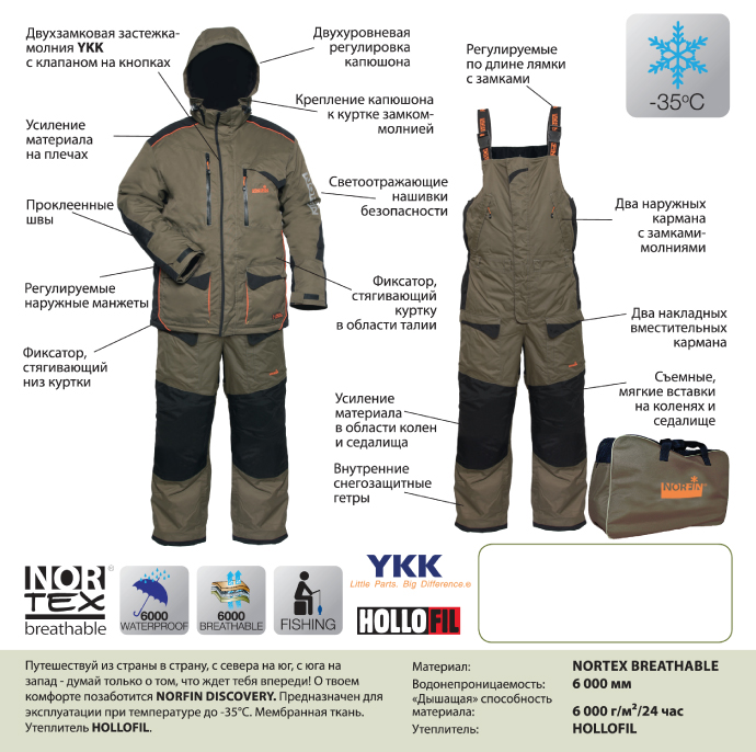 Костюм зимний Norfin Discovery - выполнен из мембранного материала NORTEX BREATHABLE. Комфортный режим носки до -35°С. Характеристики мембранной ткани Nortex Breathable демонстрируют высокую дышащую способность и защиту от влаги. Костюм лёгкий, отлично подойдёт как для активной, так и сидячей рыбной ловли. Стильный дизайн, лёгкость и демократичная цена костюма Norfin Discovery делают его лидером продаж на протяжениидолгих лет. Утеплитель HOLLOFIL.