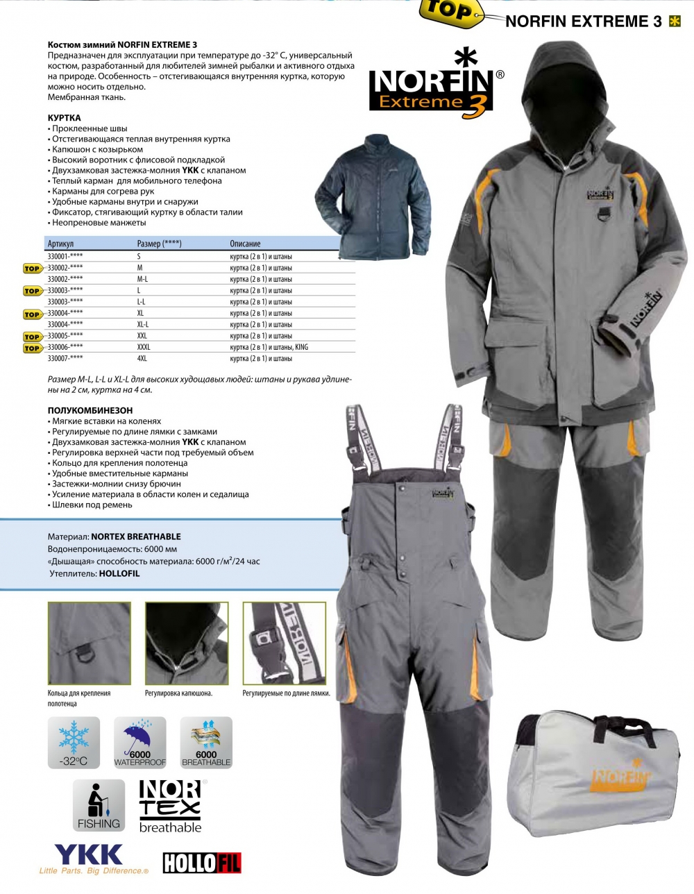 Зимний костюм Norfin Extreme 3 изготовлен из мембранной ткани Nortex Breathable, которая не промокает и в то же время дышит. Костюм имеет высокие характеристики по температурным показателям, а так же дышащей и непромокаемой способностям ткани. Отличительная особенность Norfin Extreme 3 - отстёгивающаяся внутрення куртка. Внешнюю куртку при этом можно использовать и на осенне-весенний период.